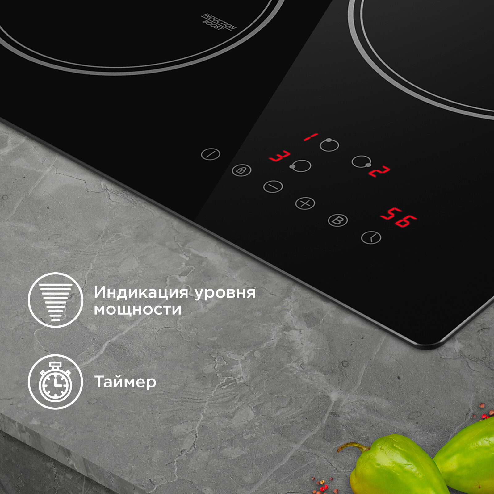 Индукционная варочная панель MAUNFELD AVI453BK черная стеклокерамика, 6.2 кВт, 3 конфорки, автоматическое отключение, защита от детей, распознавание посуды, таймер, Booster информация: