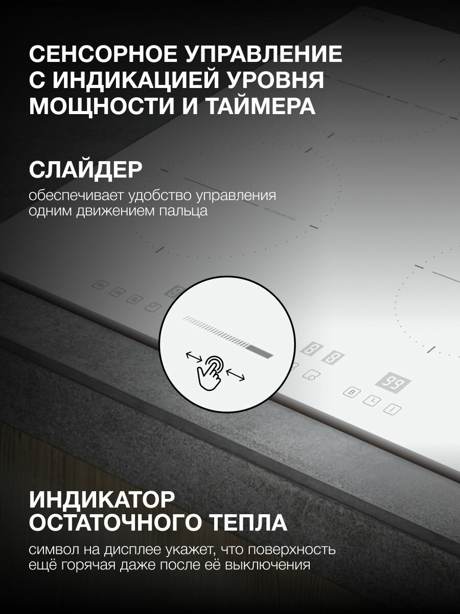 Индукционная варочная поверхность Hyundai HHI 6752 WG, Слайдерное управление, белая индикация, Инвертер, Французская стеклокерамика EUROKERA, функция паузы, скошенный передний край рамки, белый информация: