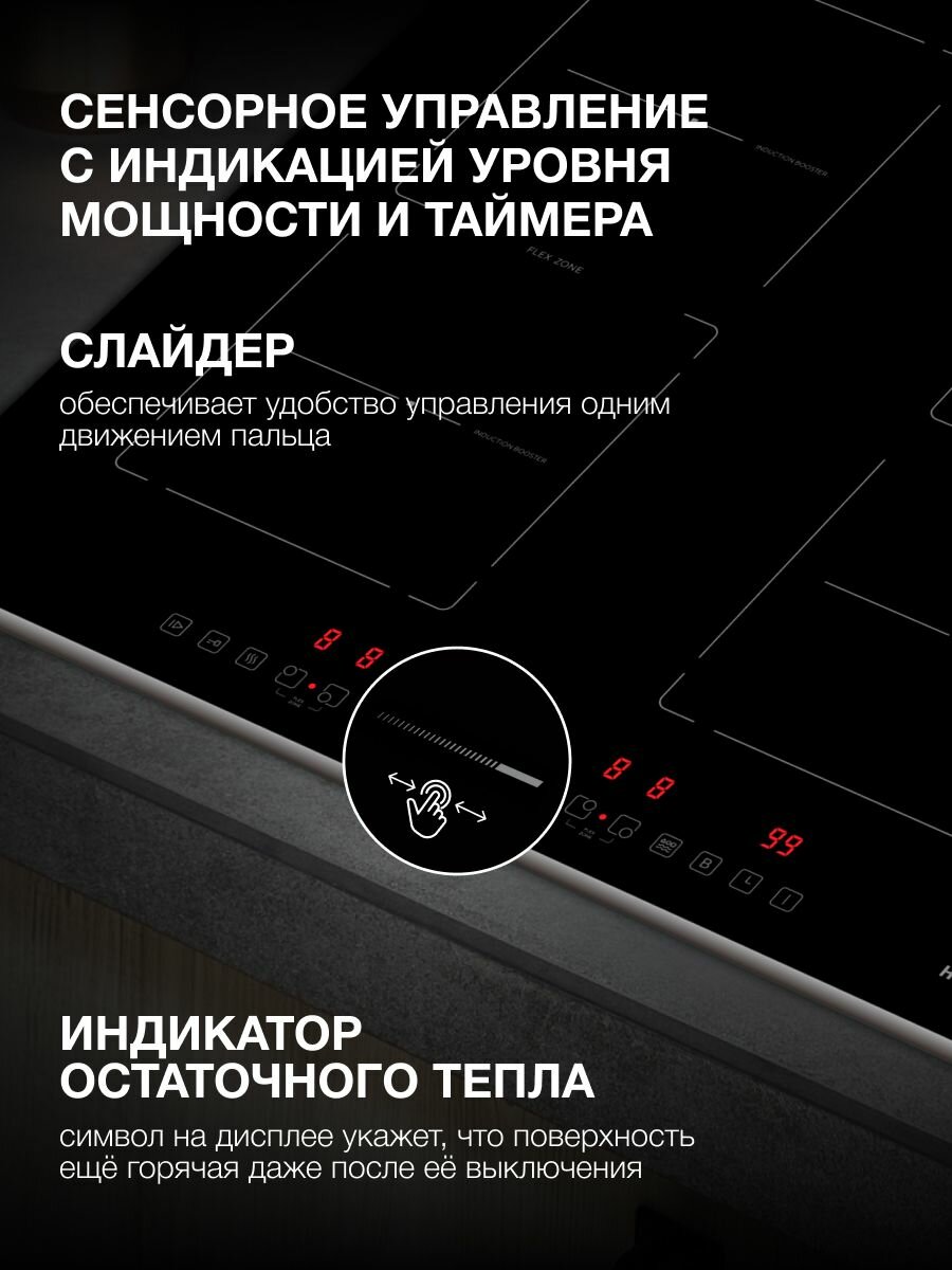 Индукционная варочная поверхность Hyundai HHI 6772 BG, Слайдерное управление, Итальянская стеклокерамика, таймер, функция автозакипания, функция паузы , передний скошенный край рамки , черный информация: