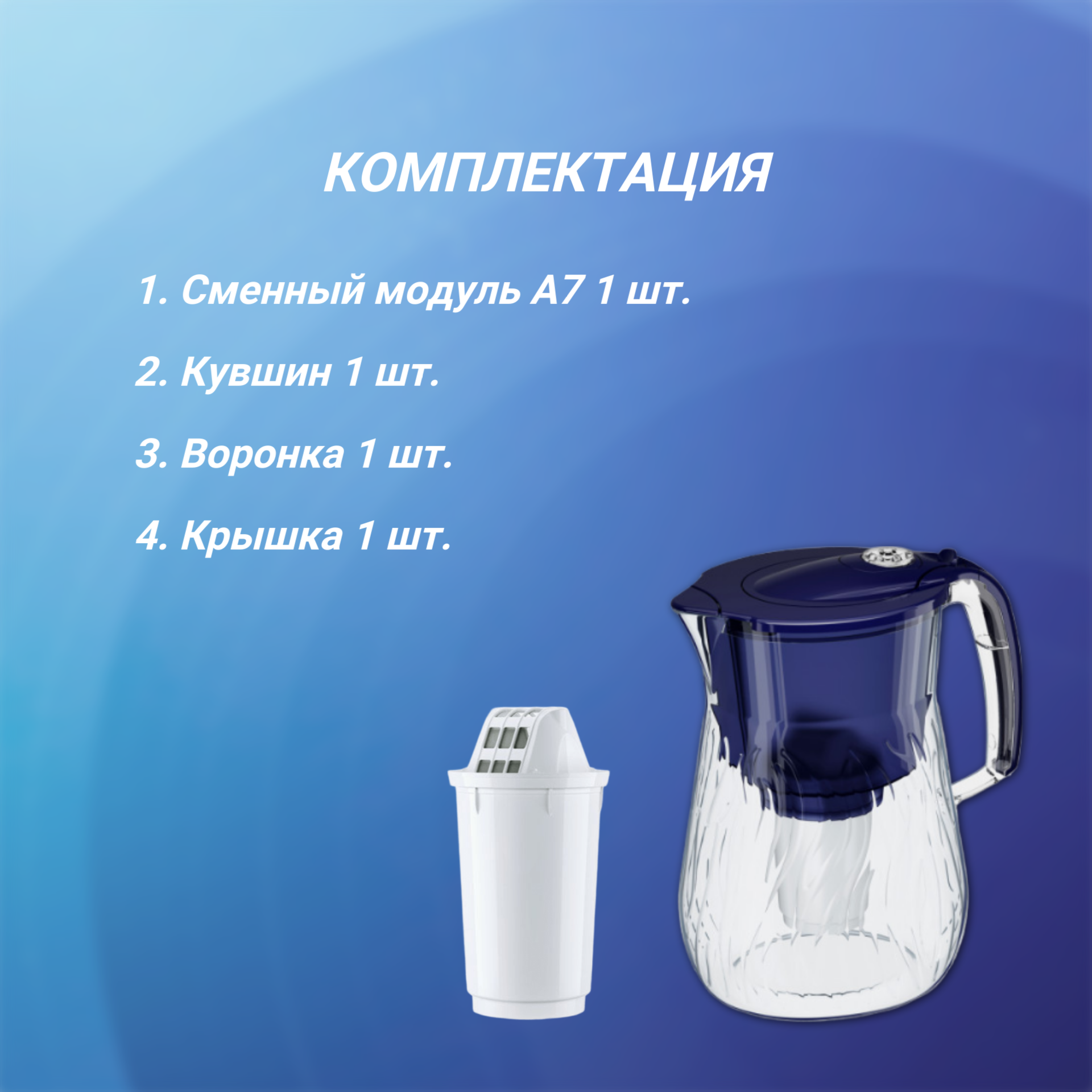 | Дополнительная информация | комплектация: сменный фильтрующий модуль A7, кувшин, воронка, крышка флип-флоп с механическим счетчиком; материал кувшина – сополиэфир Eastman TritanTM |