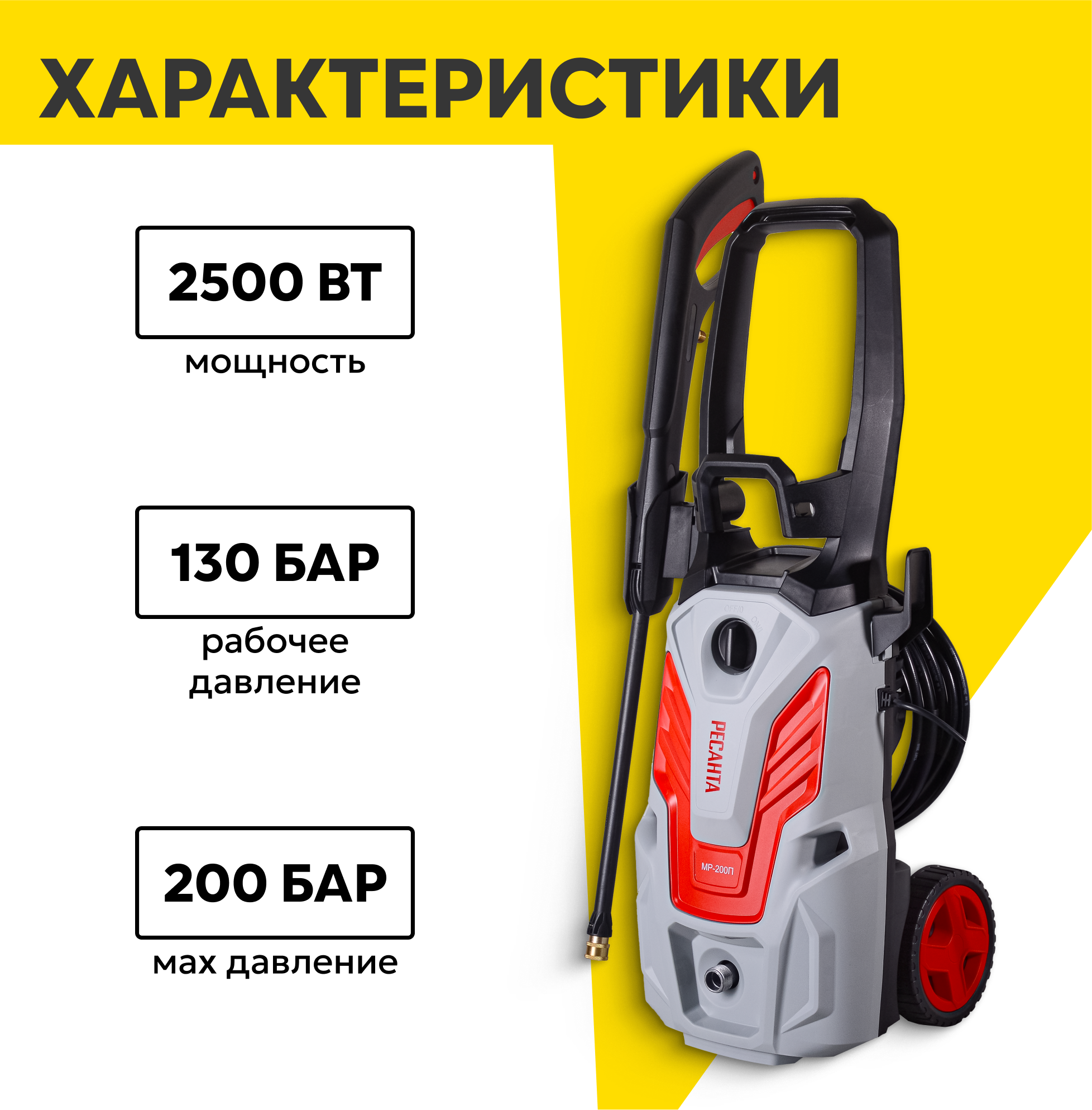 Мойка высокого давления РЕСАНТА МР-200П, 2500 Вт, 200 Бар, 420 л/ч, шланг – 8 м, проф. пеногенератор информация: