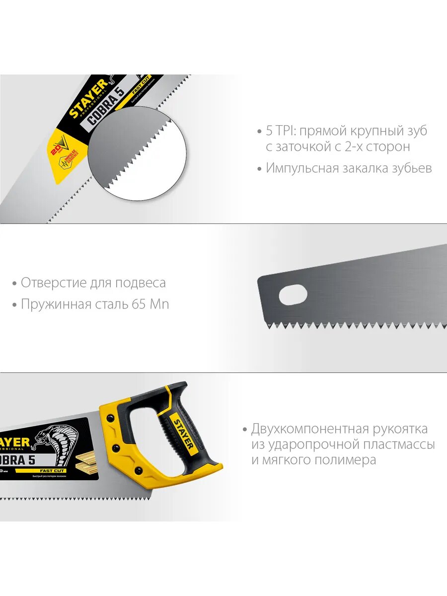 Ножовка по дереву (пила) Cobra 5 500 мм, 5 TPI, прямой крупный зуб, быстрый рез поперек волокон, для крупных и средних заготовок, STAYER 1506-50_z02