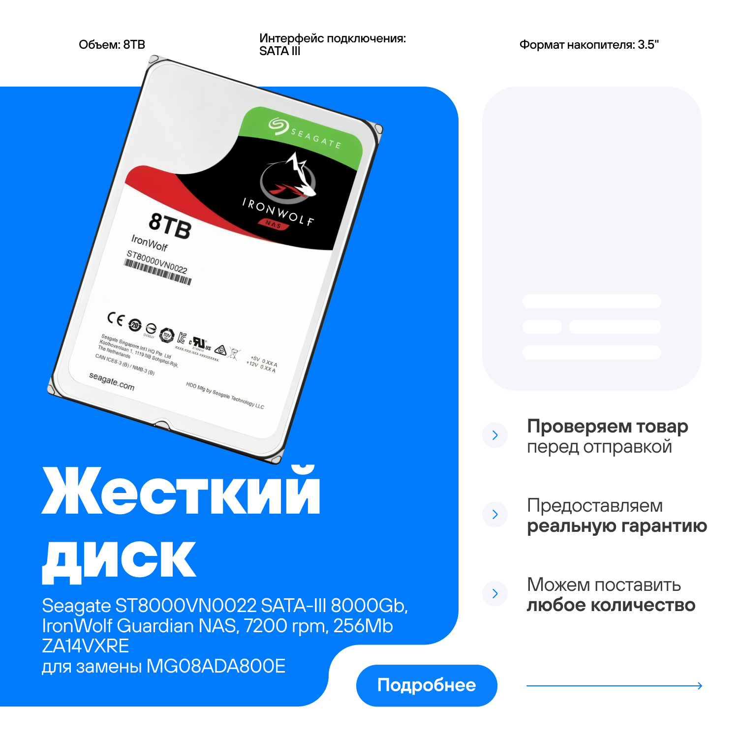 Жесткий диск Seagate st8000vn0022 SATA-III 8000Gb IronWolf Guardian NAS 7200 rpm 256Mb ZA14VXRE совместим для замены с MG08ADA800E информация: