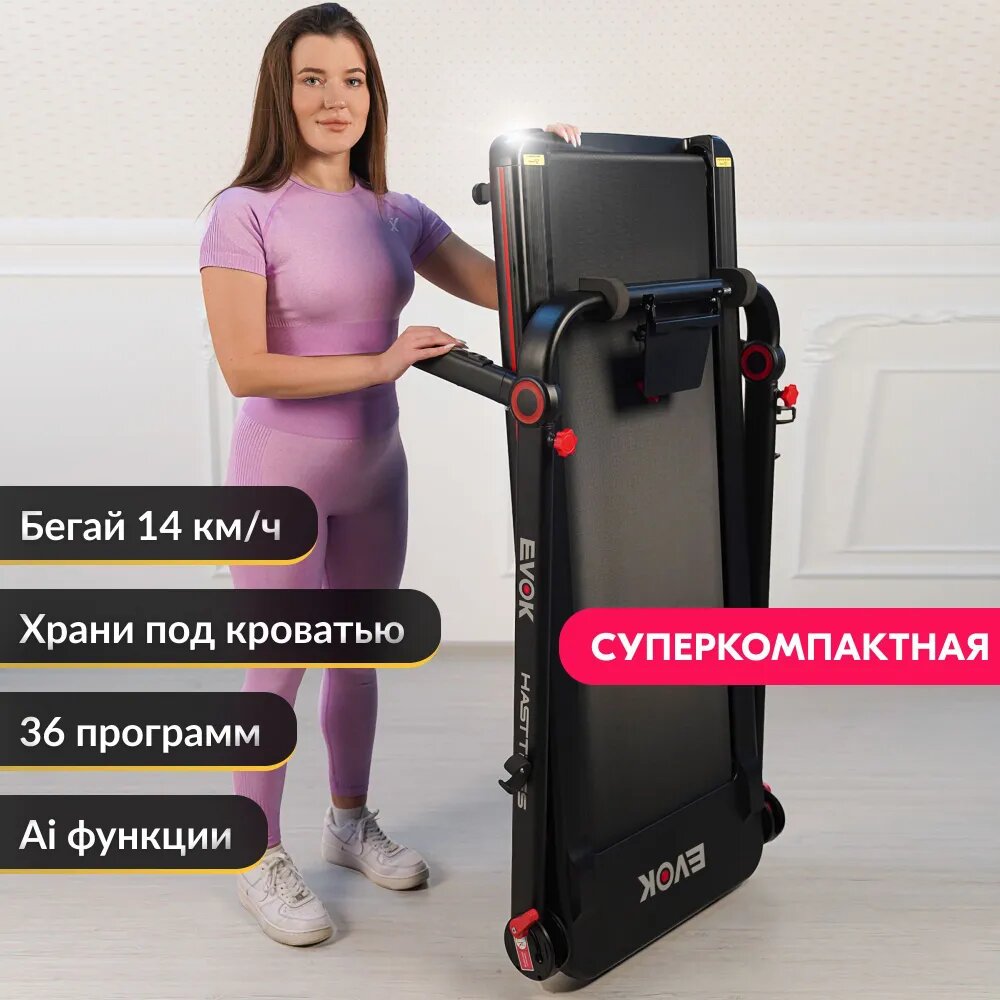 Беговая дорожка Hasttings EVOK - складная/ до 110 кг/ до 300 ккал за 1 ч/суперкомпактная/ 1,5 л.с/ 36 программ/ модуль охлаждения двигателя
