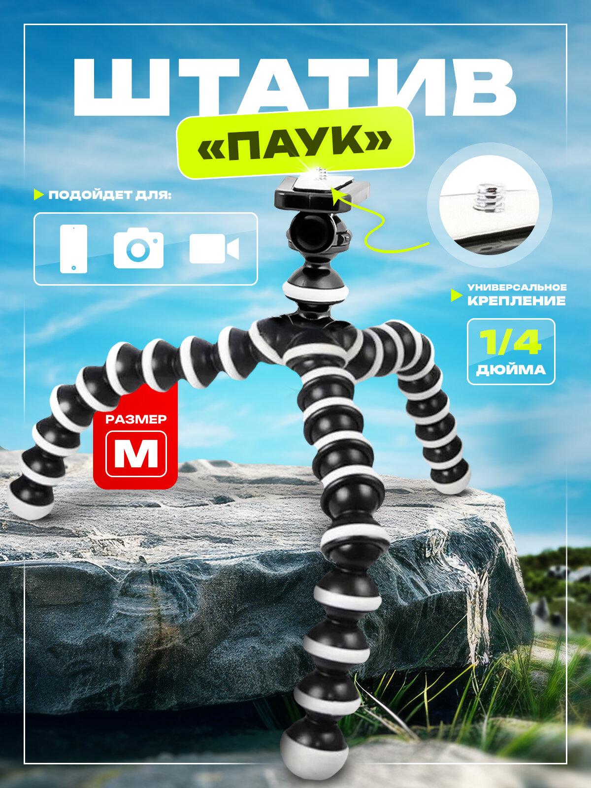 Штатив-паук ISA Octopus FLEX-26 гибкий / длина 26.5 см, возможность крепления на разных поверхностях, гибкая конструкция ножек, крепление 1/4", черно-белый