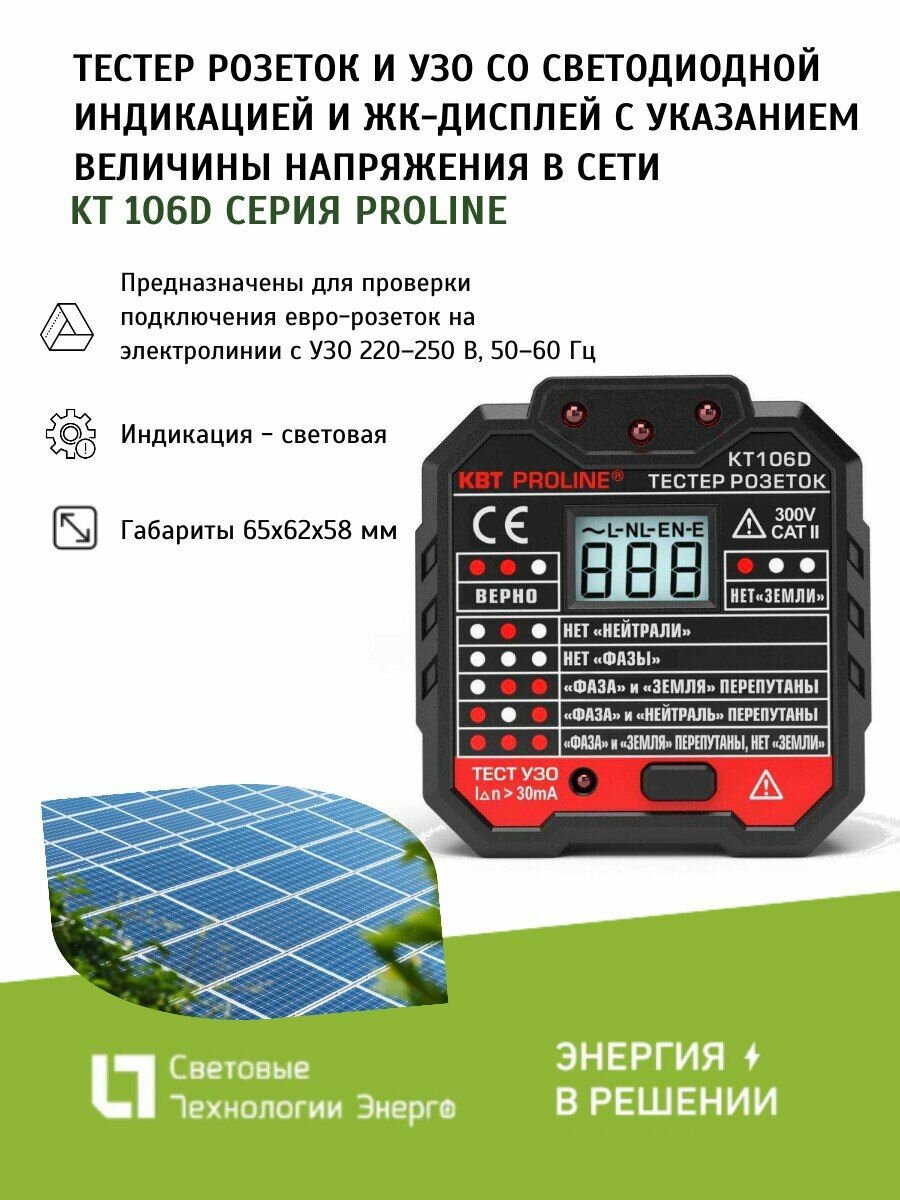 Тестер розеток и УЗО KT 106D серия PROLINE со светодиодной индикацией и ЖК-дисплей с указанием величины напряжения в сети, КВТ (79136) информация: