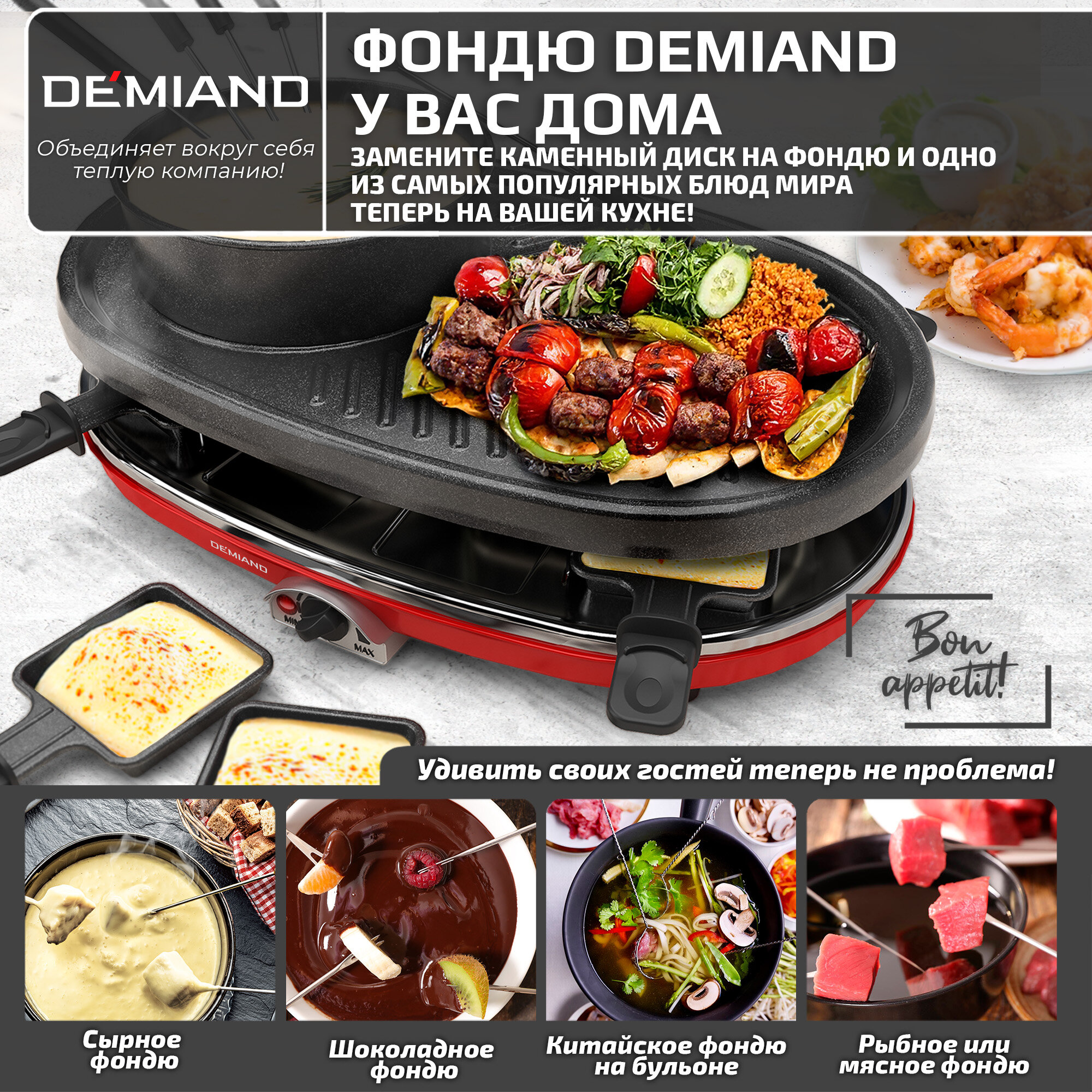 Раклетница-Гриль-Фондю DEMIAND 5 в 1,8 раклет-сковородок, каменный круг, набор фондю с 6-ю шпажками,8 лопаток, книга рецептов,1500Вт, Raclette1158 информация: