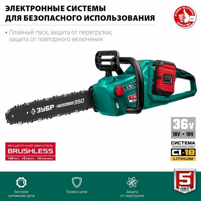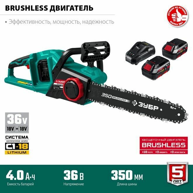 ЗУБР С1-18, 36 В, 35 см шина, 2х18 В АКБ (4 Ач), бесщеточная цепная пила (ПЦЛ-3635-42) информация: