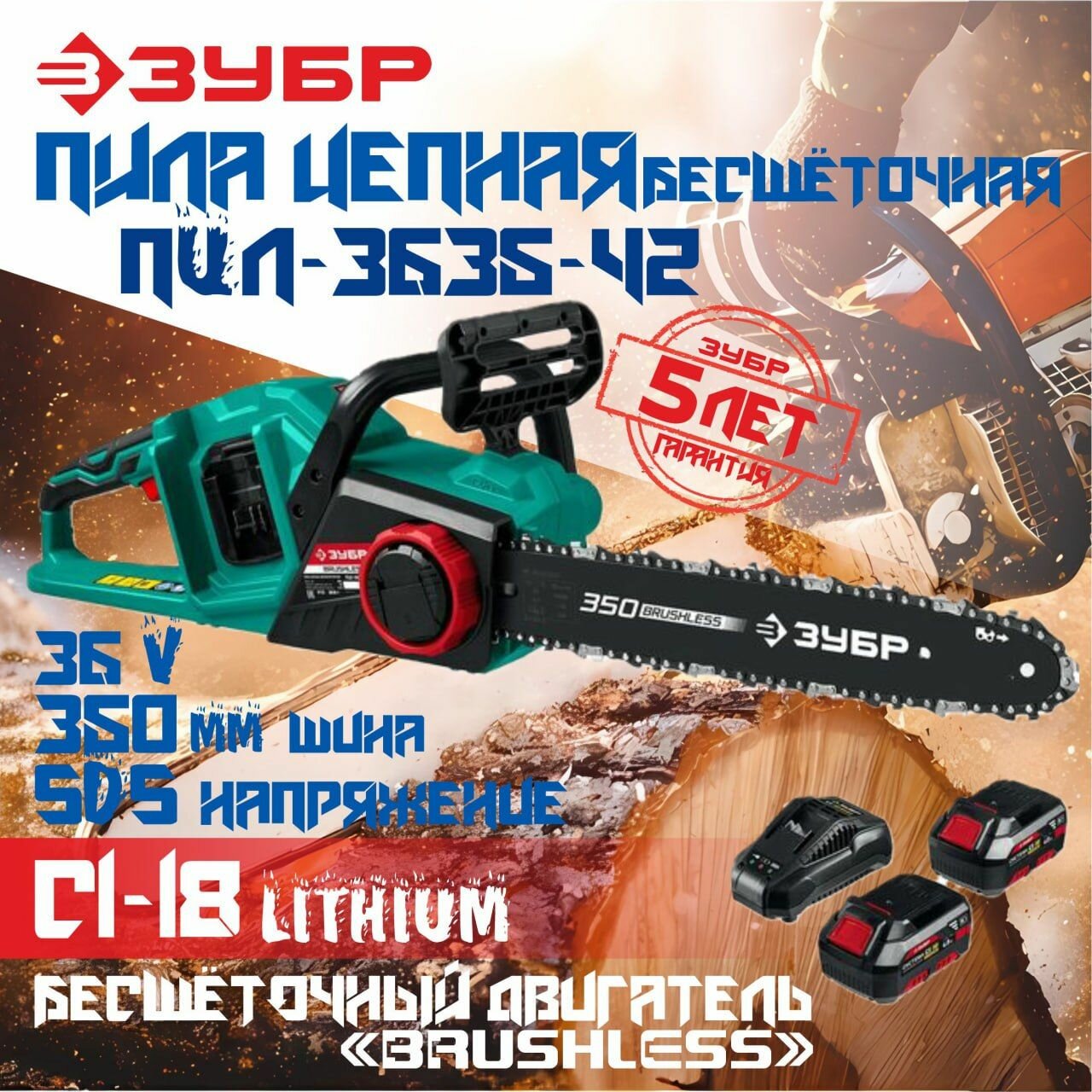 ЗУБР ПЦЛ-3635-42 36В бесщеточная пила цепная, 2х18В АКБ (4Ач).