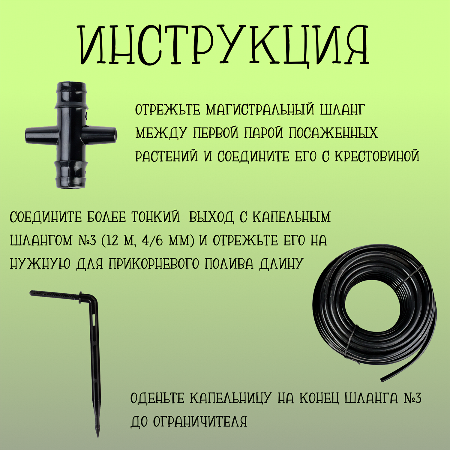 | Комплектация | • Шланг 12/15 мм для соединения бочки с Тройником большим - 3 м; • Магистральный шланг 7/9 мм для соединения Тройника большого с Крестовинами - 15 м; • Шланг капельниц 4/6 мм для соединения крестовин с капельницами - 12 м; • Капельница (капельный дозатор) - 60 шт.; • Крестовина - 30 шт.; • Заглушка – 3 шт.; • Тройник большой с пробкой - 1 шт.; • Штуцер – 1 шт. • Кран с фильтром – 1 шт. |