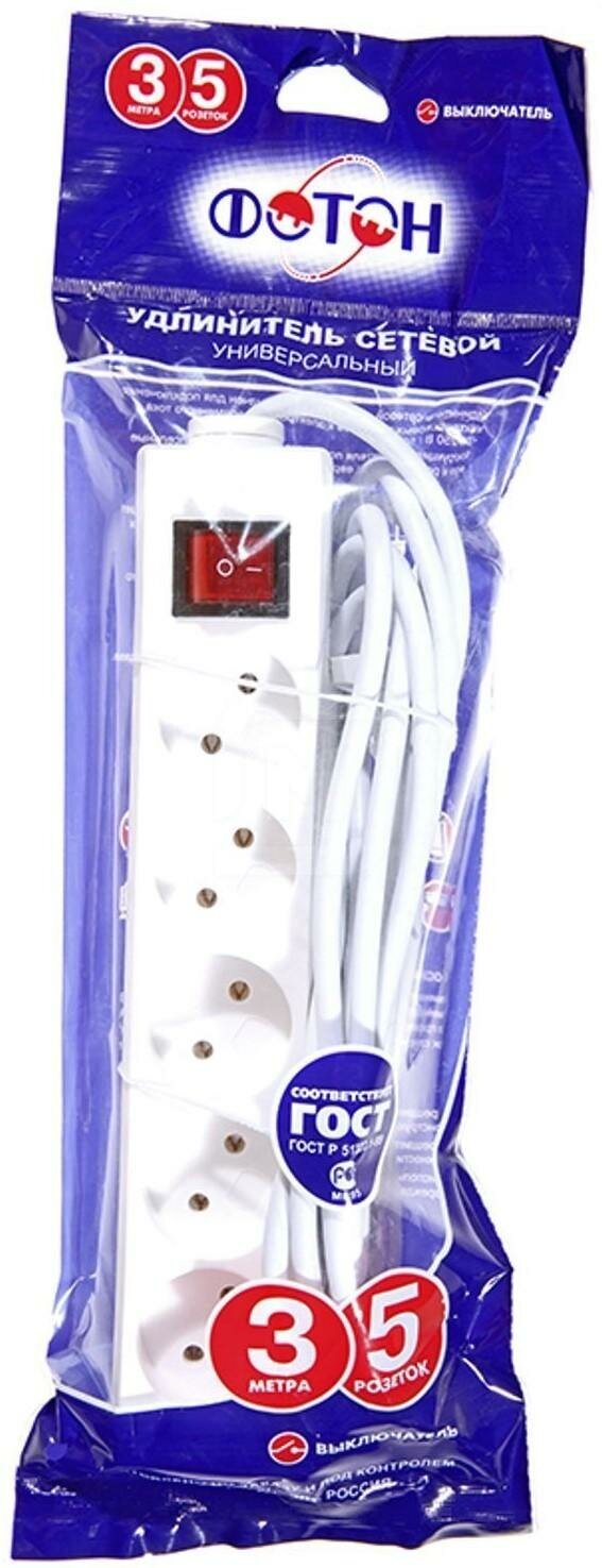 Отзывы на Удлинитель сетевой фотон 10-35S, 3м, 5 розеток, 10А, с выкл, Белый