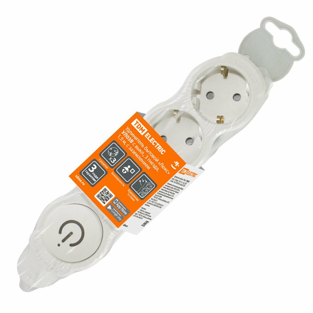 Отзывы на Удлинитель бытовой 3 гнезда, 1.5 м, ПВС, 3х1 мм², с заземлением, 16 А, выключатель, 250 В, с защитными шторками, бело-серый, TDM Electric, Люкс УЛ03В, SQ1303-0130