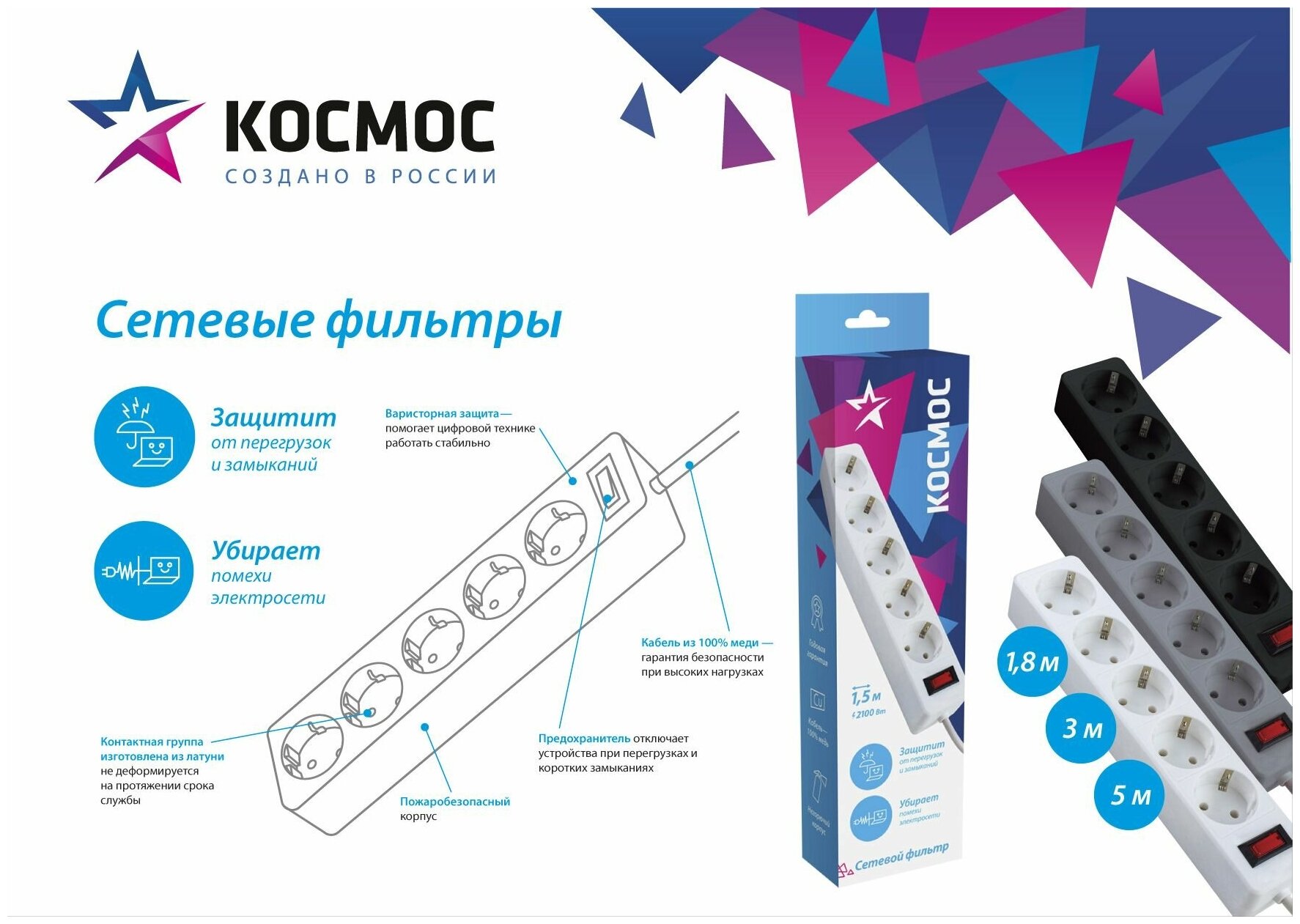 Отзывы на Сетевой фильтр космос, 1.5м, 4 гнезда с заземлением, с предохранителем, 10А/2.2 Квт, серый