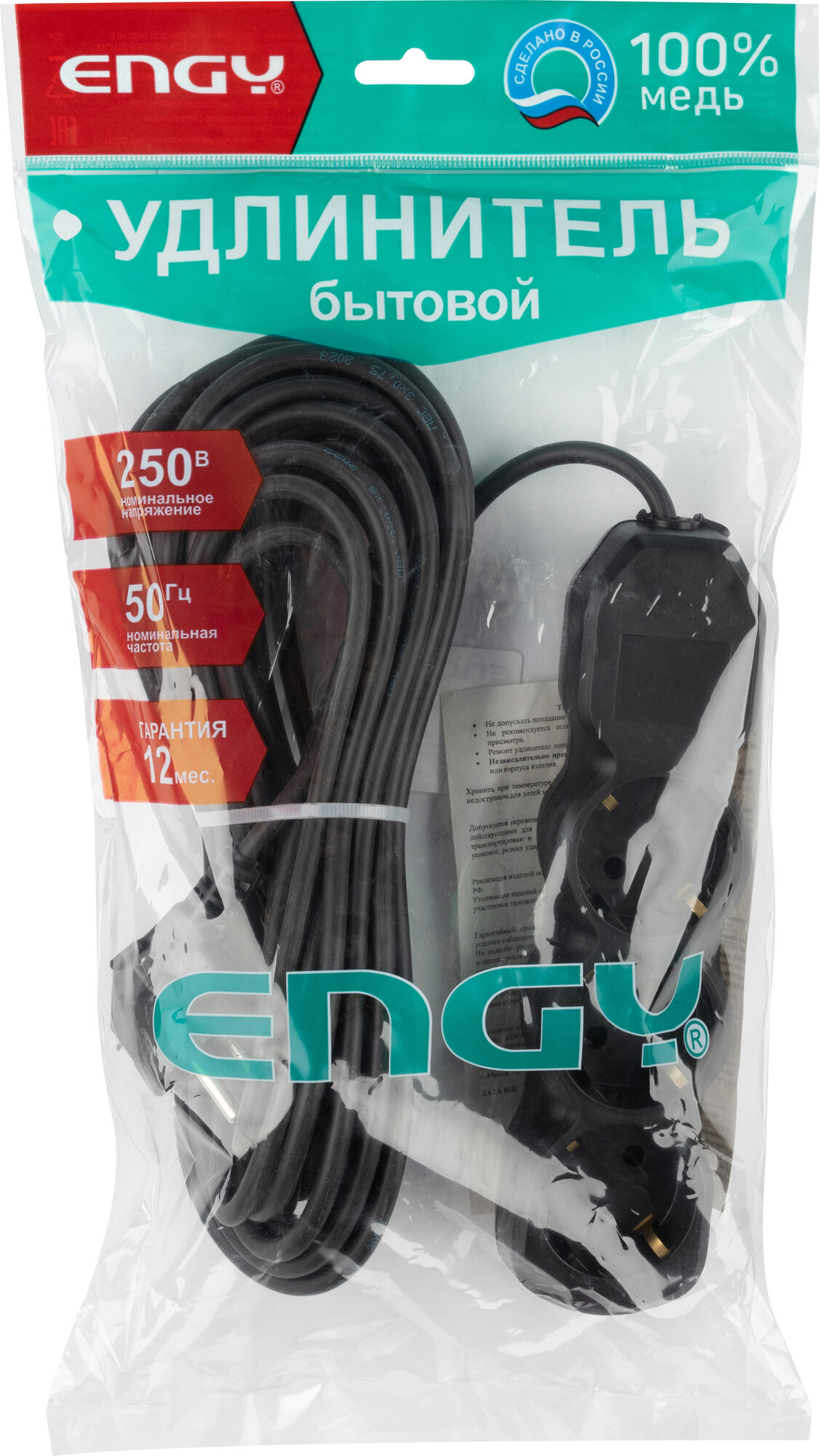 Удлинитель электрический с заземлением Engy "Гранд", 10 метров, 3 розетки, черный информация: