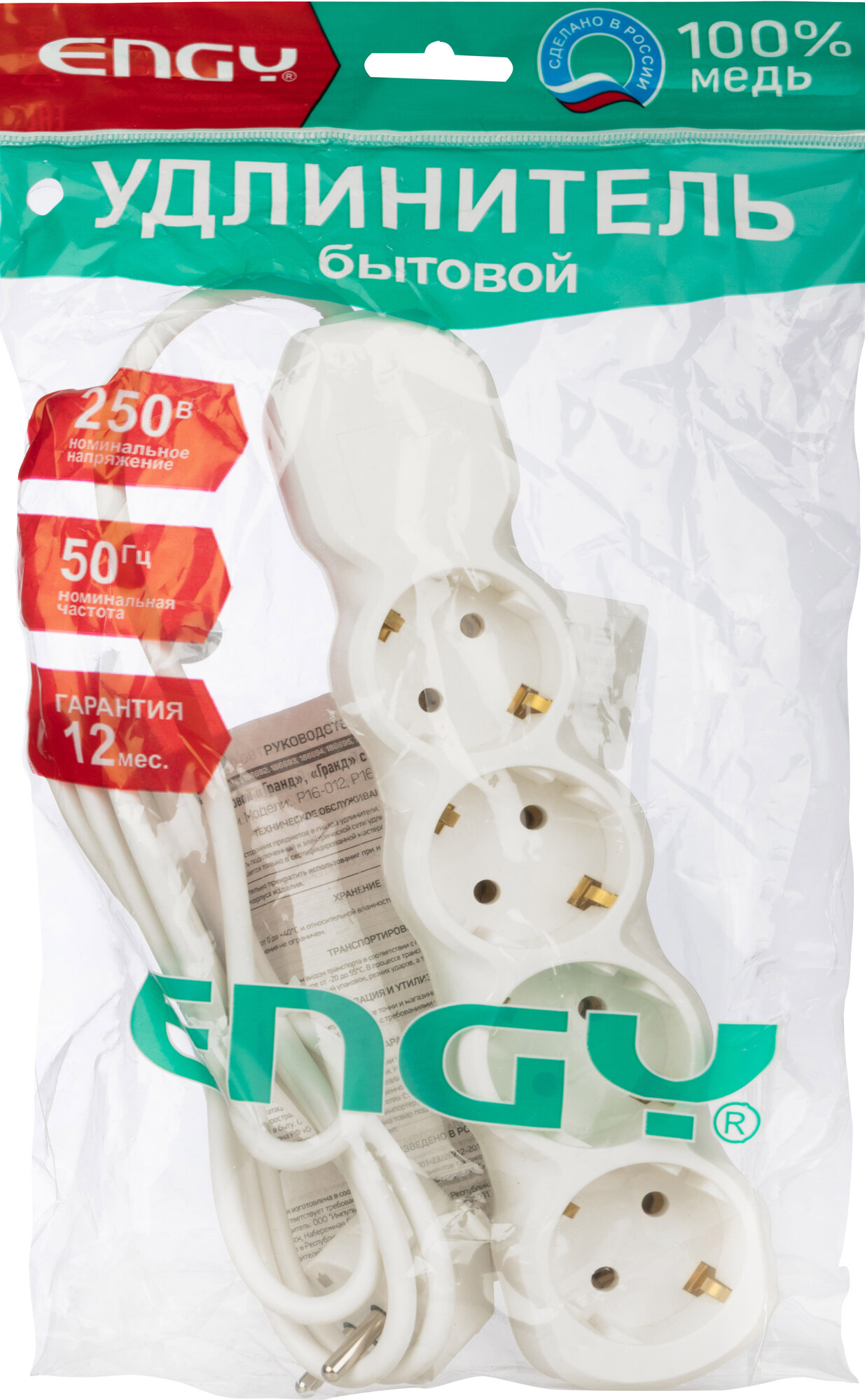 Удлинитель электрический с заземлением Engy "Гранд", 1.7 метра, 4 розетки, белый информация:
