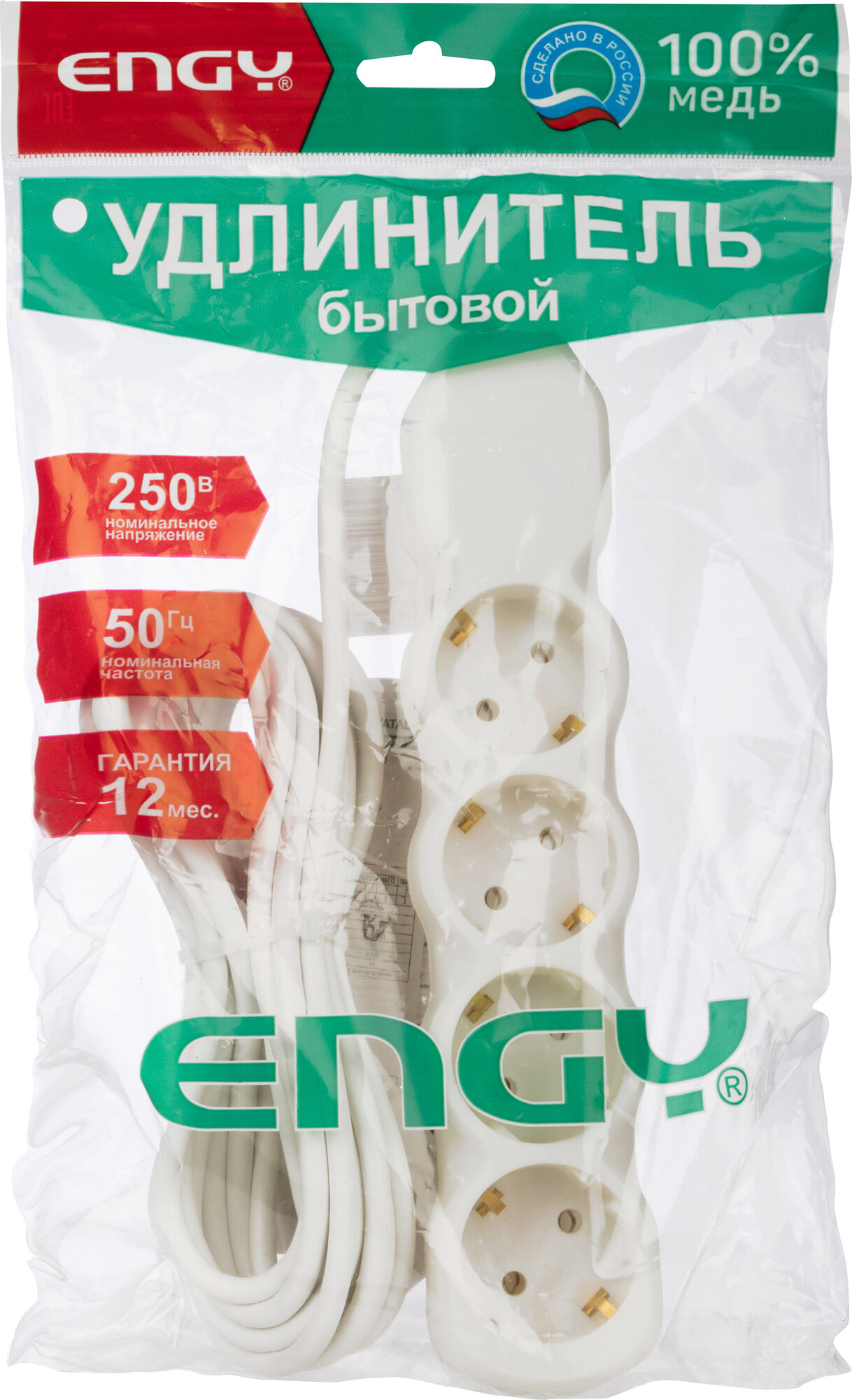 Удлинитель электрический с заземлением Engy "Гранд", 5 метров, 4 розетки, белый информация: