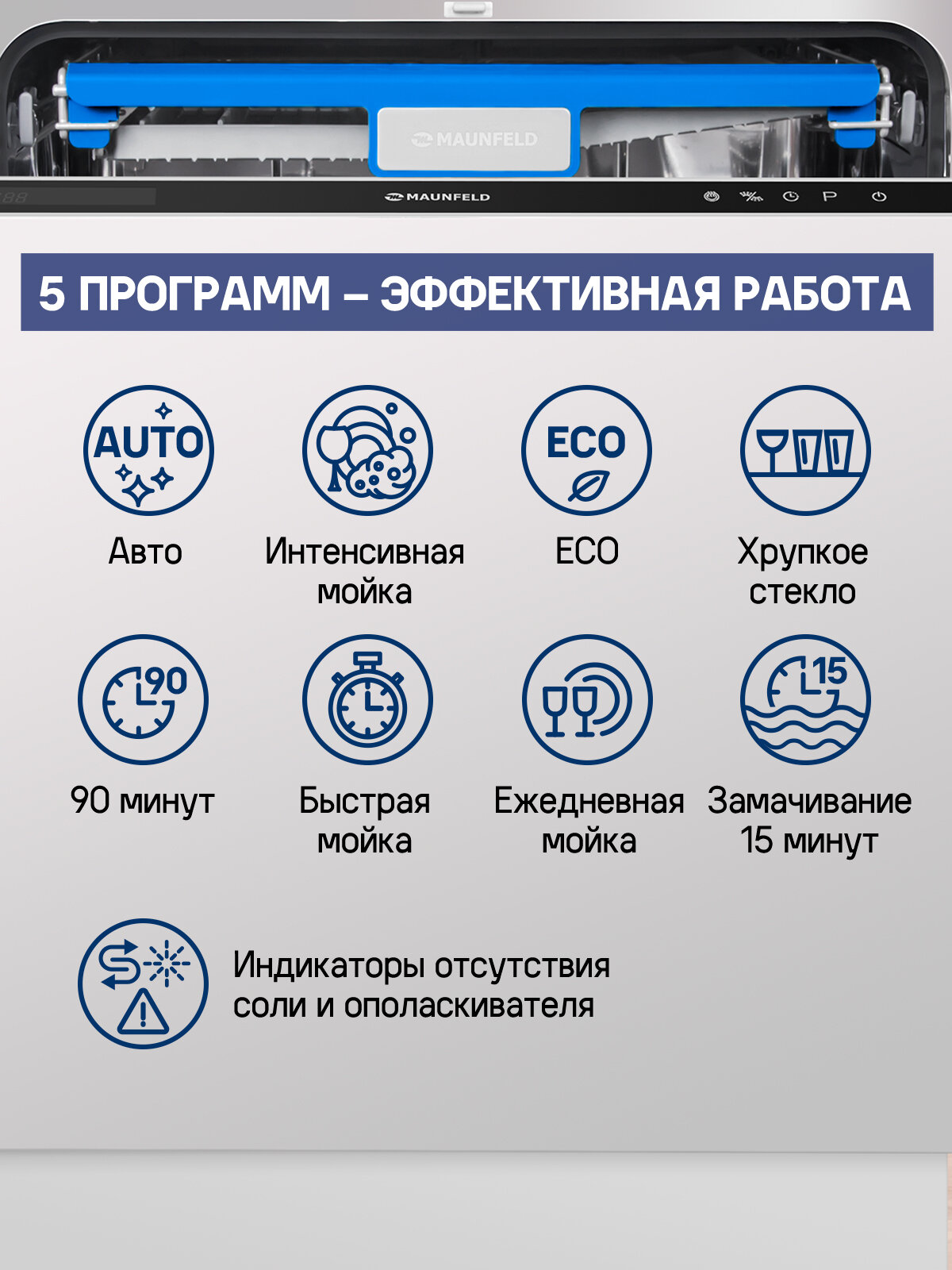 Посудомоечная машина MAUNFELD MLP-12IM встраиваемая 60 см, 14 комплектов, 8 программы, 3 корзины, автоматическая мойка, сенсорное управление, луч на полу информация: