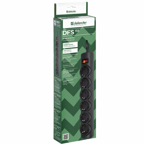 Defender DFS 155 (5 м, 6 розеток) Сетевой фильтр Defender DFS 155 5 м, черный, 6 розеток 99496