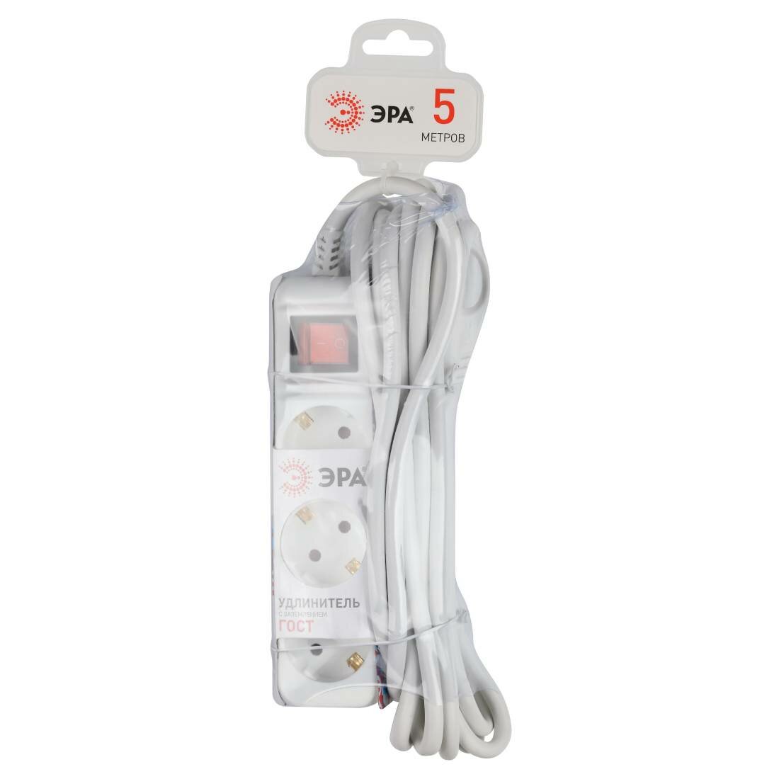 10 цен на Удлинитель электрический ЭРА U-3es-5m-3x1,5 16А с заземлением с выключателем 3 розетки 5м белый Б0044041