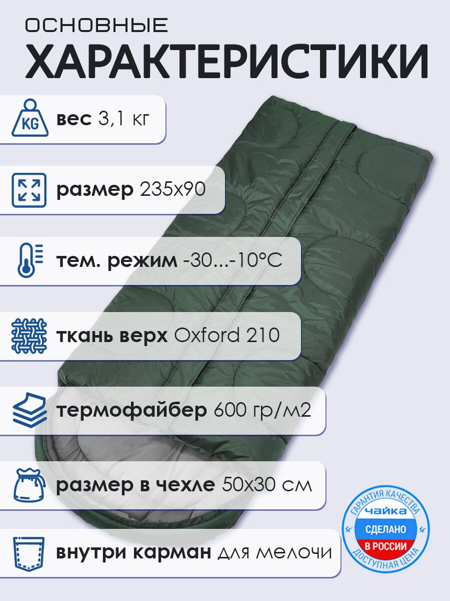 10 цен на Спальный мешок "Чайка GEO", зимний, хаки, 235x90 см, до -20°C