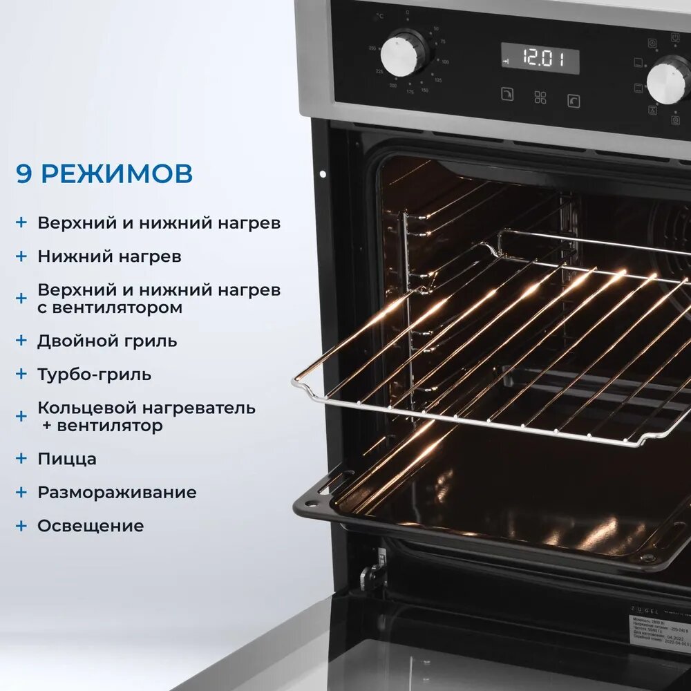 10 цен на Духовой шкаф электрический встраиваемый ZUGEL ZOE452X, 2800 Вт, 50 л, утапливаемые регуляторы, дисплей, 9 режимов работы, гриль, конвекция, эмаль, серый