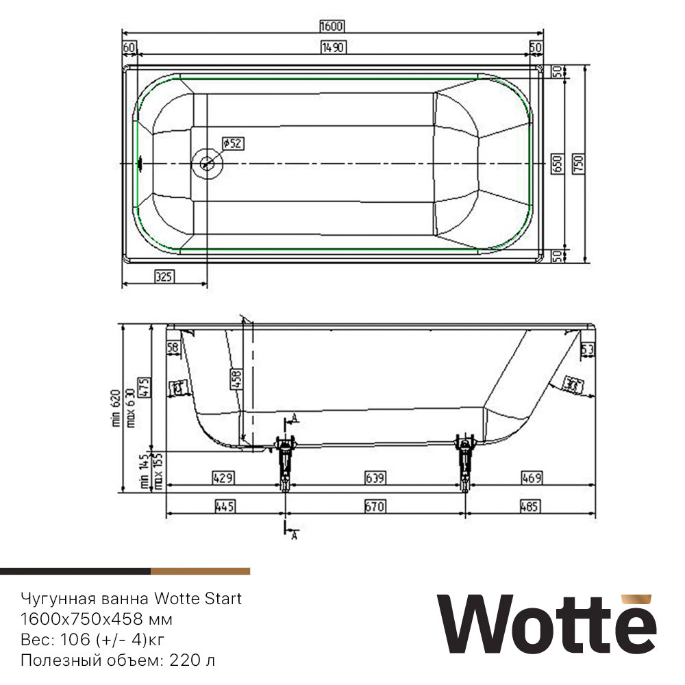 Wotte Чугунная ванна Wotte Start 160x75 БП-э0001106 без антискользящего покрытия 48 676 ₽