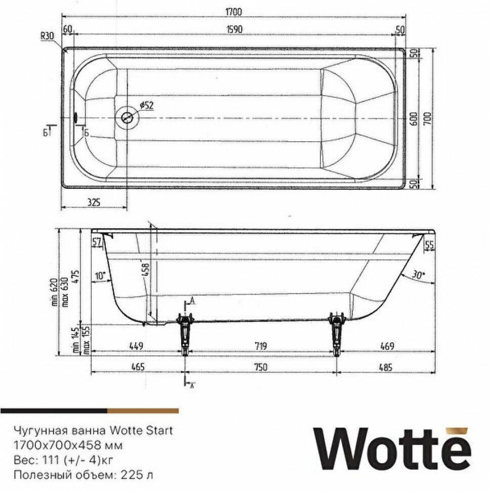 Чугунная ванна Wotte Start 170x70 см белая, глянцевая, с ножками и ручками информация: