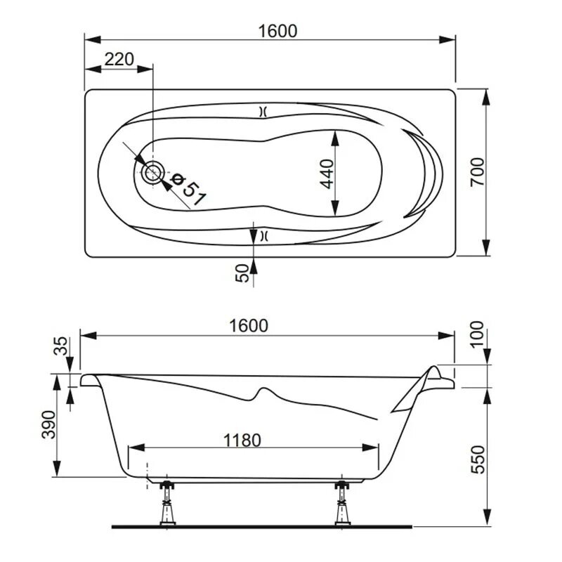 Акриловая ванна ARAGUT Кама 160х70 прямоугольная, в комплекте с каркасом, белая