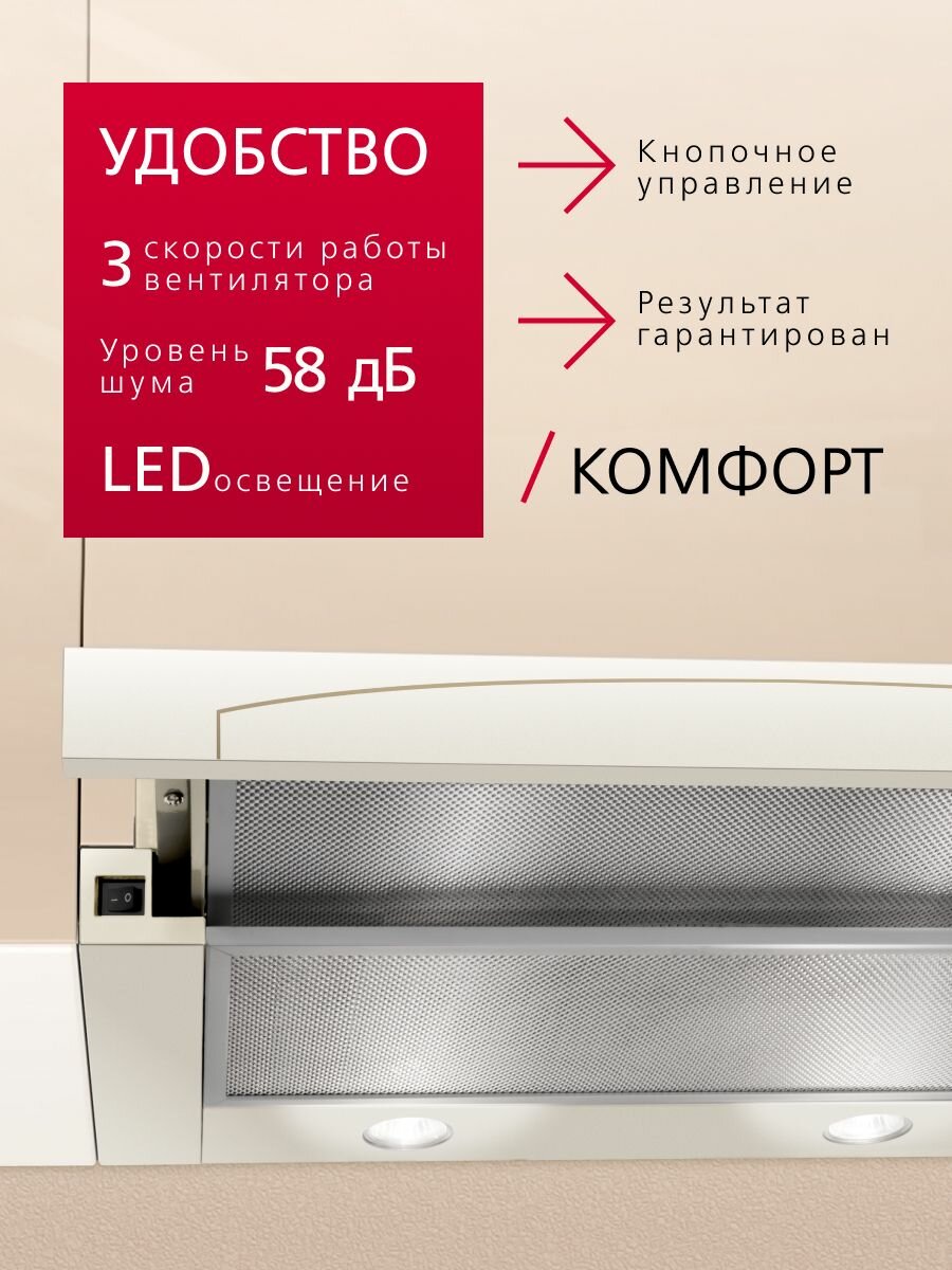 10 цен на Телескопическая вытяжка Hansa OTP6242RIH, 60 см, механическое управление, 3 скорости, режимы отвода и рециркуляции, светодиодная подсветка, цвета слоновой кости