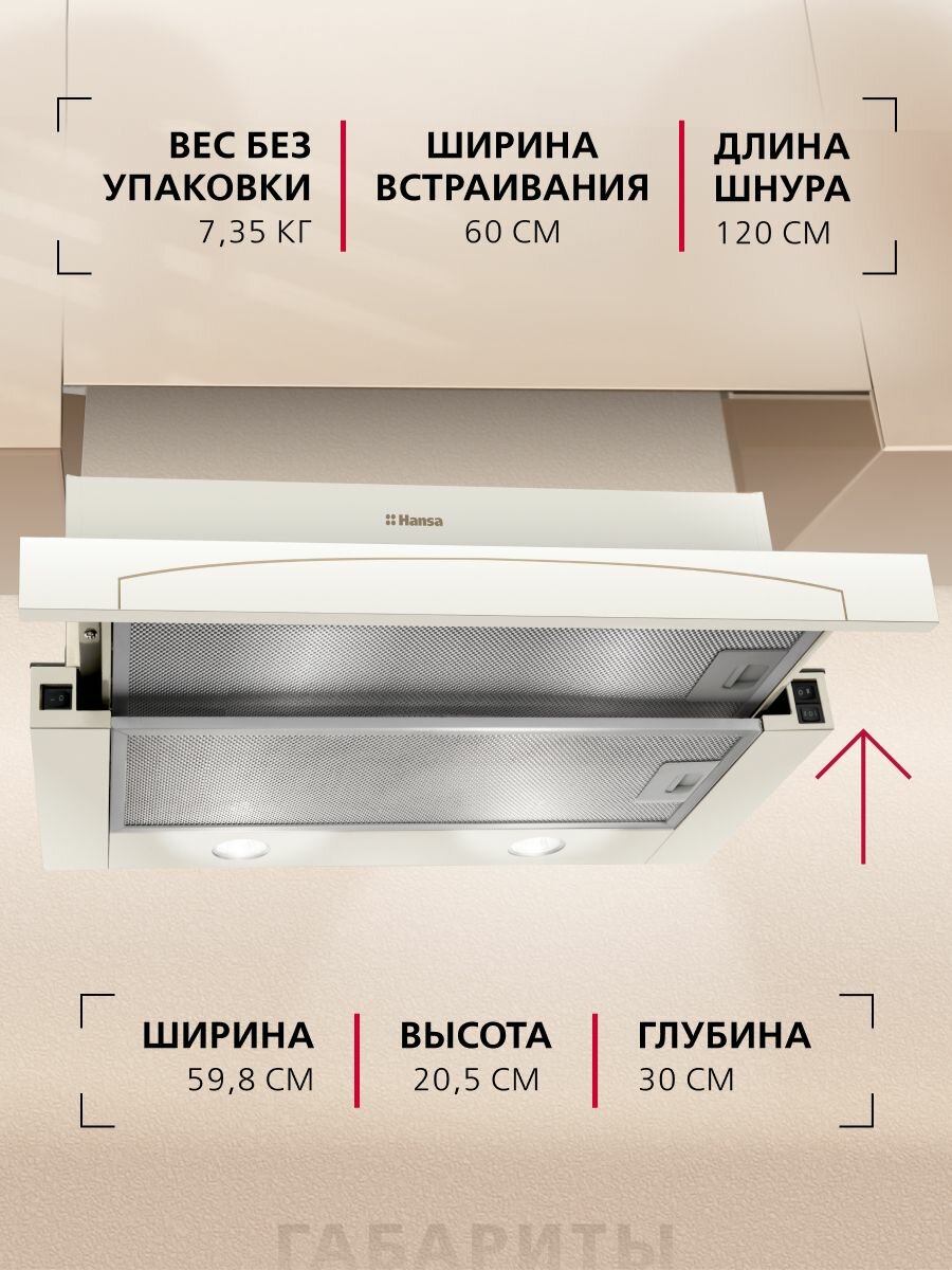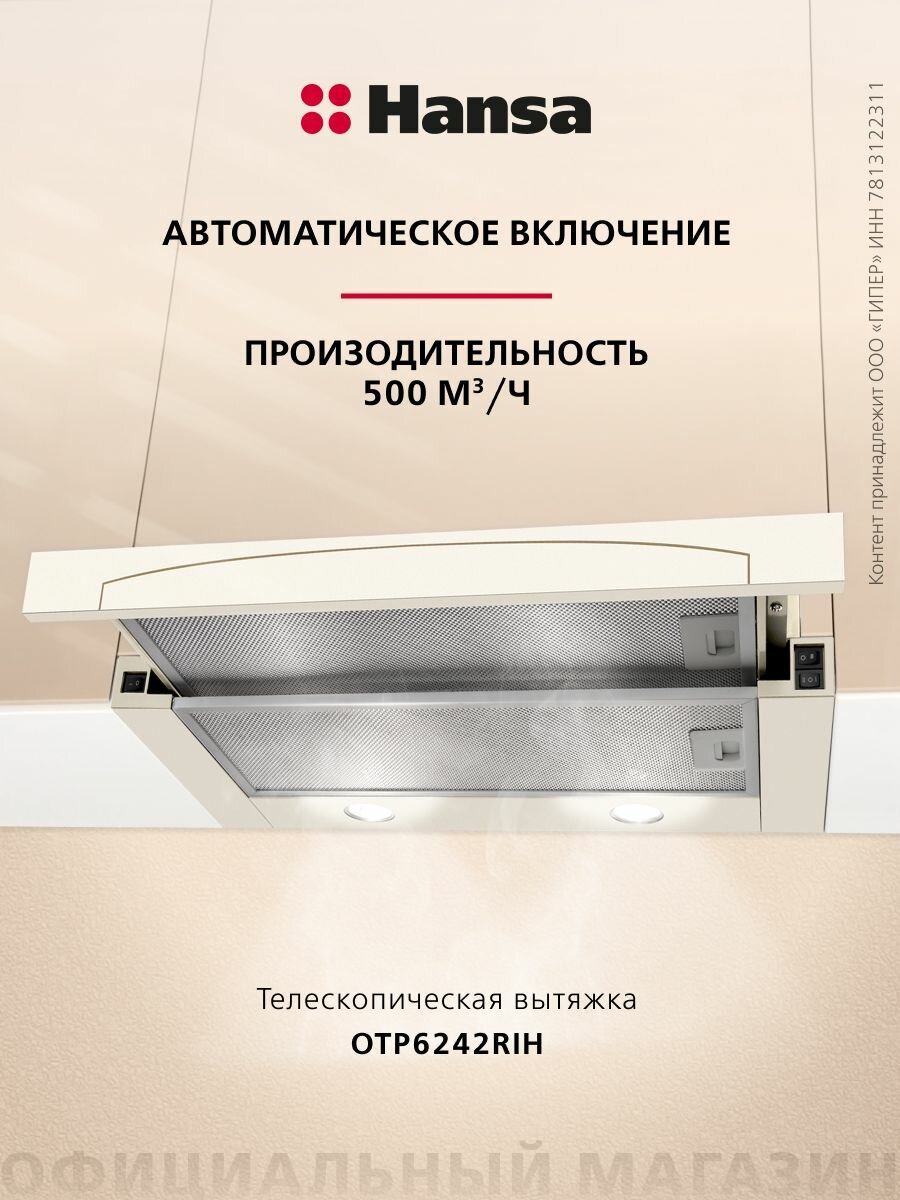 Телескопическая вытяжка Hansa OTP6242RIH, 60 см, механическое управление, 3 скорости, режимы отвода и рециркуляции, светодиодная подсветка, цвета слоновой кости информация: