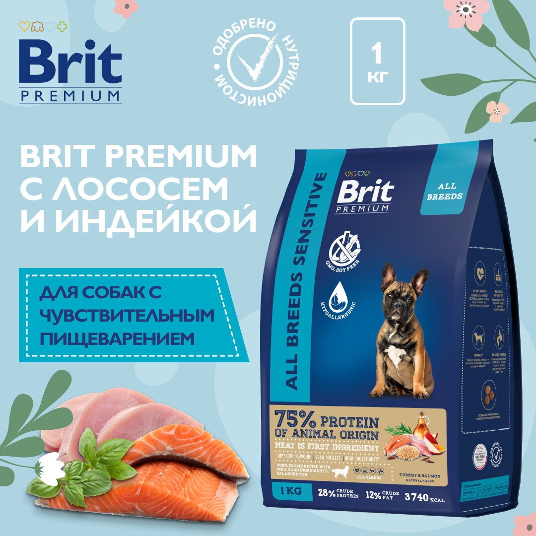 10 цен на Сухой корм для собак премиум класса с лососем и индейкой всех пород с чувствительным пищеварением, 1кг Brit