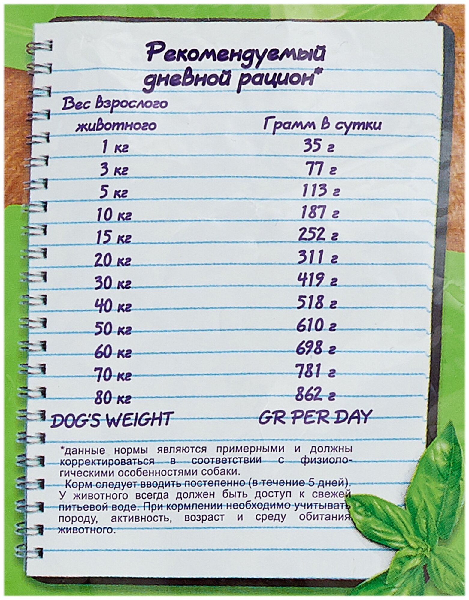 | Дозировка | вес собаки (грамм в сутки): 5-20 кг (140-390); 20-30 кг (390-530); 30-40 кг (530-660); 40-50 кг (660-780); 50-60 кг (780-900); 60-70 кг (900-1000) |