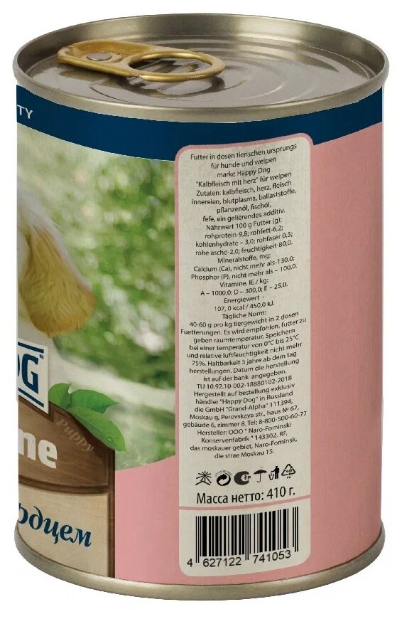 "Happy Dog" корм для щенков с телятиной и сердцем 410г информация: