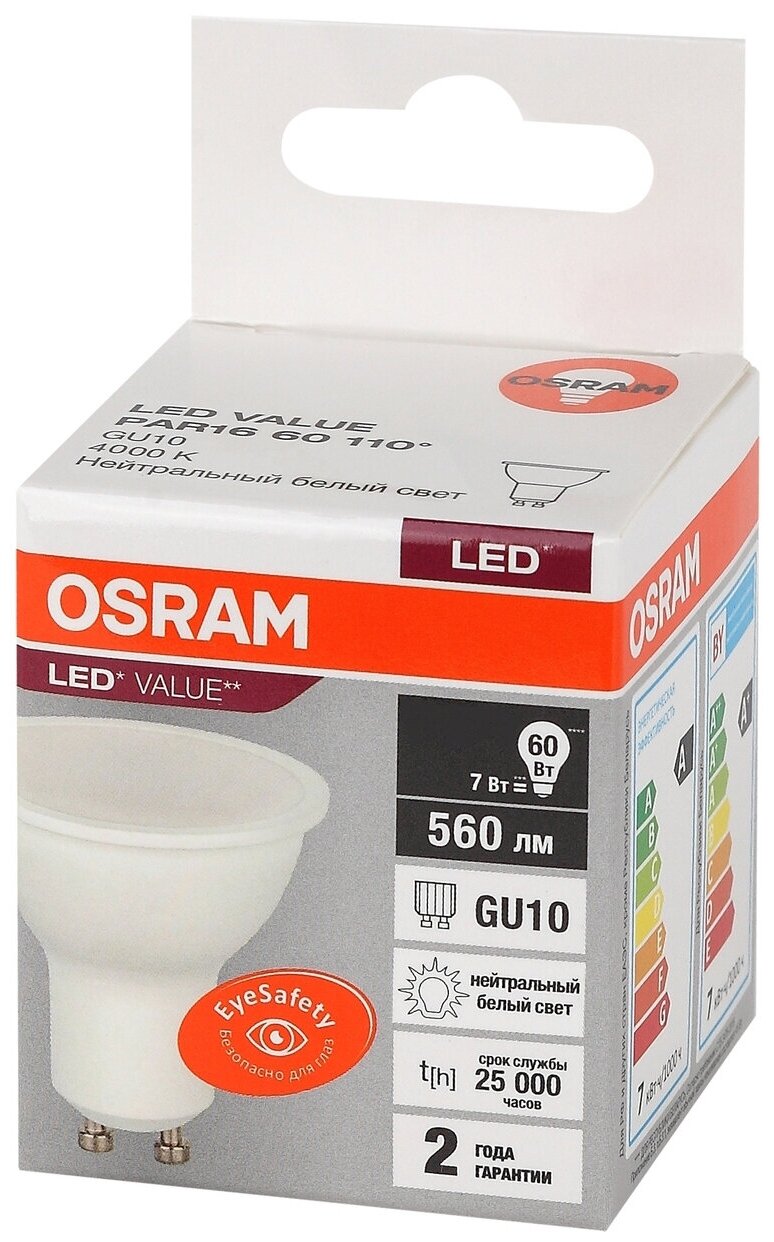 10шт/уп. Лампа LED Софит 7Вт 220-240V GU10 PAR16 560Лм 4000К Угол 110 град. D-50mm L-54mm Свет Дневной белый OSRAM, уп. 10шт информация:
