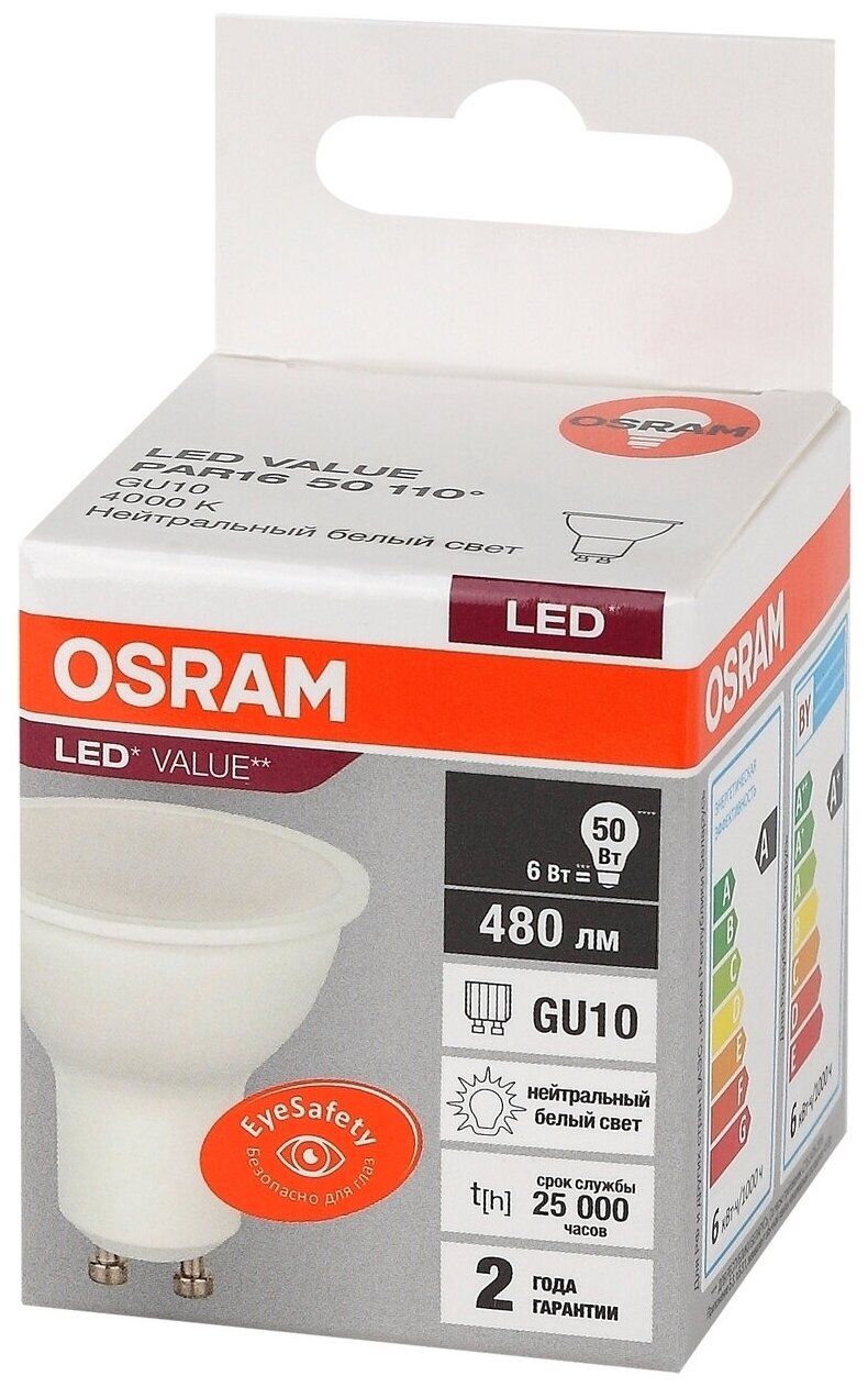 Отзывы на 10шт/уп. Лампа LED Софит 6Вт 220-240V GU10 PAR16 480Лм 4000К Угол 110 град. D-50mm L-54mm Свет Дневной белый OSRAM, уп. 10шт
