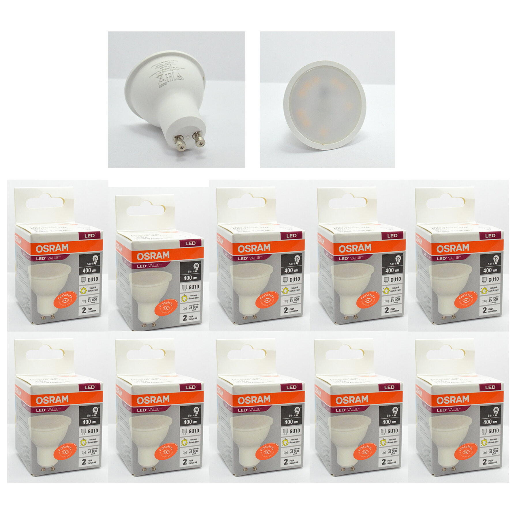 10 цен на 5шт/уп. Лампа LED Софит 5Вт 220-240В GU10 PAR16 400Лм 3000К Угол 110 град. d 50mm h 54mm Свет Теплый белый Osram, уп. 5шт