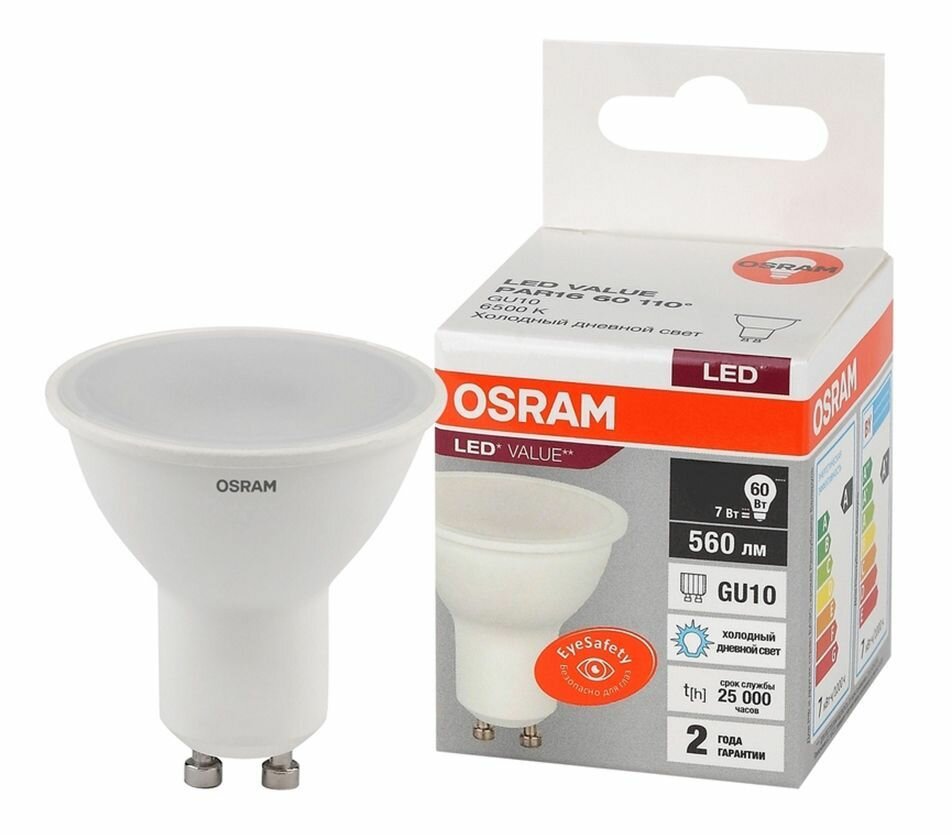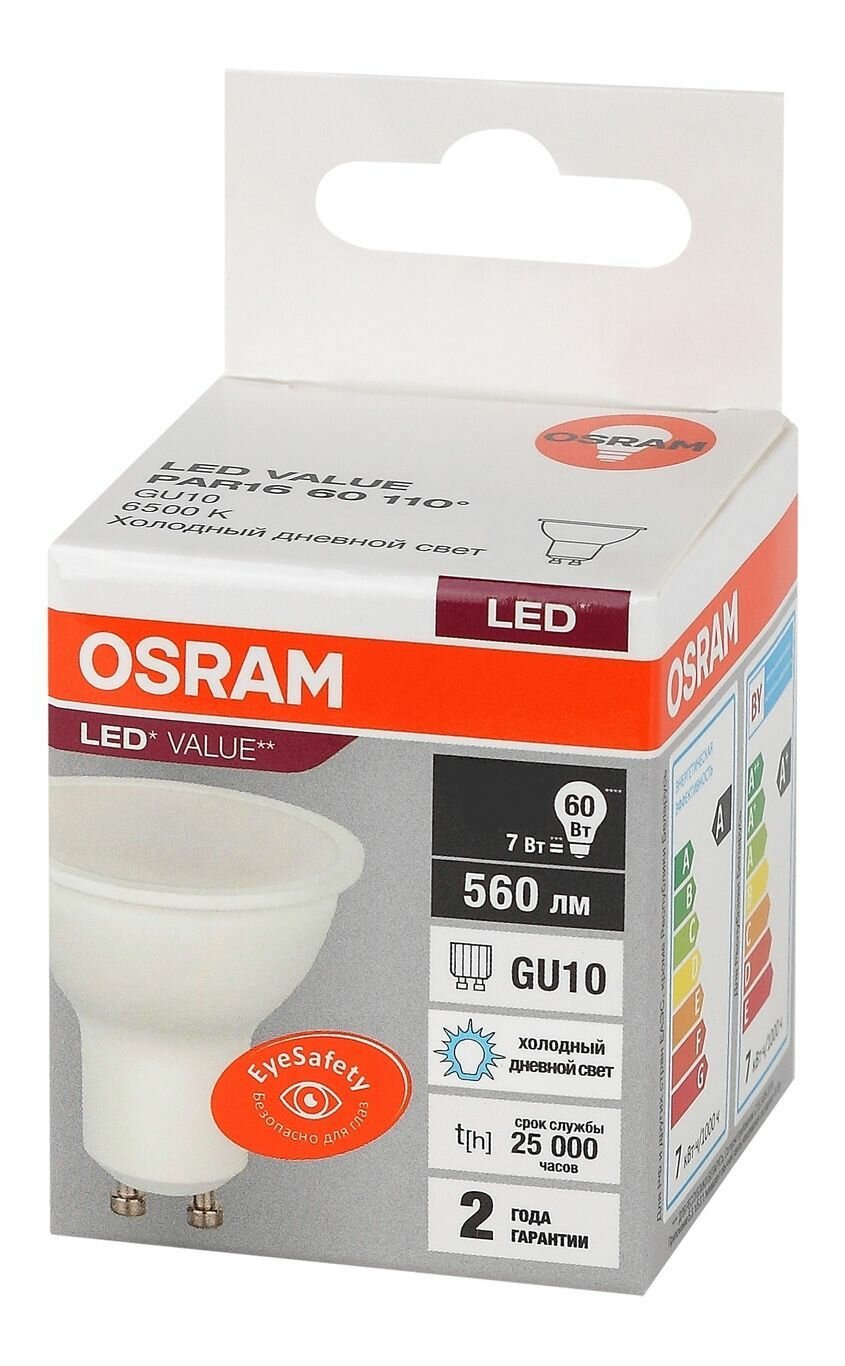 Отзывы на 5шт/уп. Лампа LED Софит 7Вт 220-240В GU10 PAR16 560Лм 6500К Угол 110 град. d 50mm h 54mm Свет Холодный белый Osram, уп. 5шт