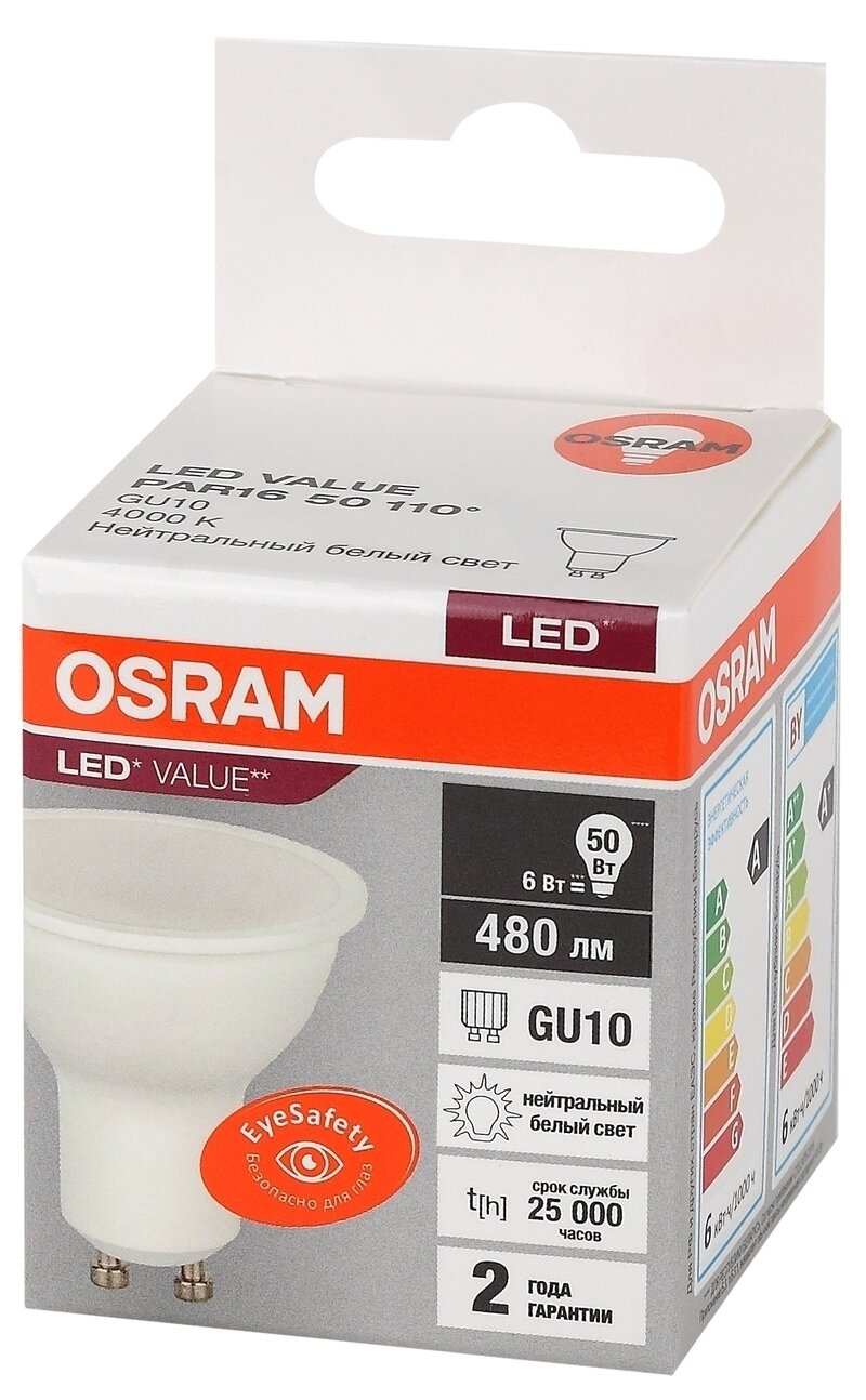 Лампа светодиодная OSRAM LED Value PAR16, 480лм, 6Вт (замена 50Вт), 6500К (холодный белый свет). Цоколь GU10, колба PAR16, софит