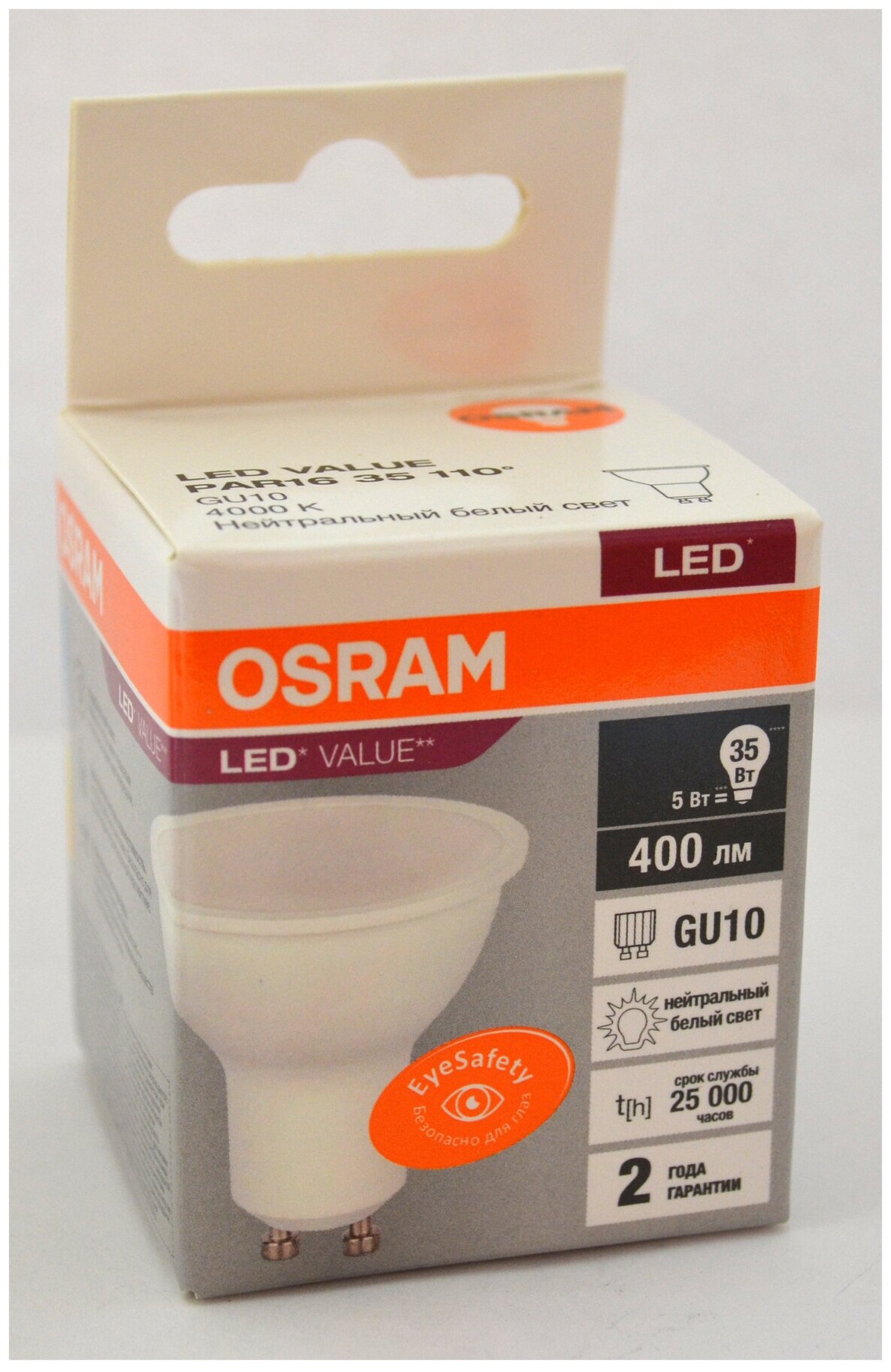 10 цен на 10шт/уп. Лампа LED Софит 5Вт 220-240V GU10 PAR16 400Лм 4000К Угол 110 град. D-50mm L-54mm Свет Дневной белый OSRAM, уп. 10шт