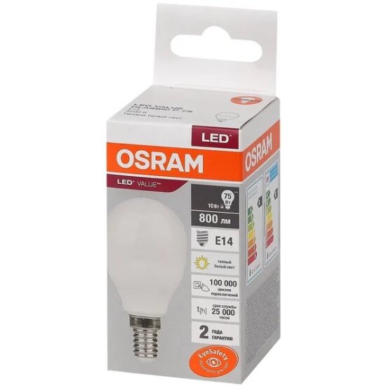Лампа светодиодная LED Value LVCLP75 10SW/830 10Вт шар матовая E14 230В 10х1 RU OSRAM 4058075579712