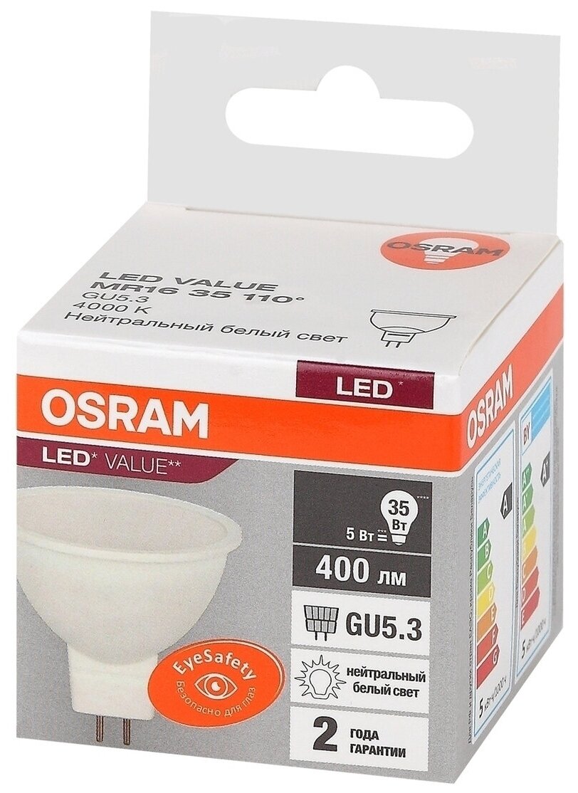 10шт/уп. Лампа LED Софит 5Вт 220-240V GU5.3 MR16 400Лм 4000К Угол 110 град. D-50mm L-46mm Свет Дневной белый OSRAM, уп. 10шт информация:
