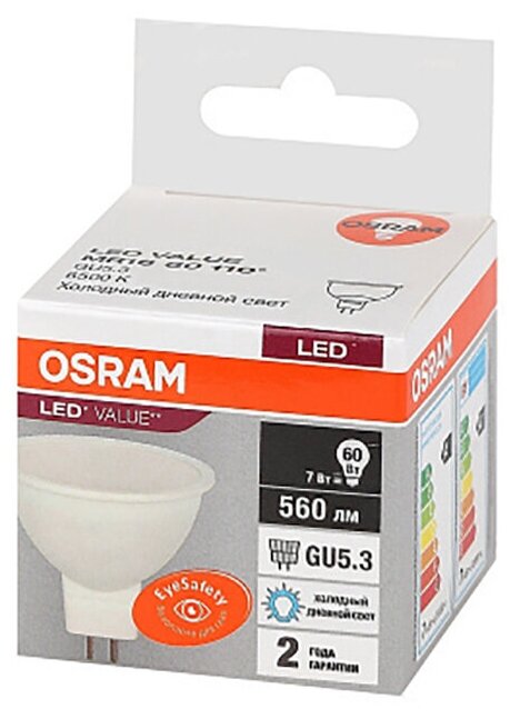 Лампа светодиодная OSRAM LED Value MR16, 560лм, 7Вт (замена 60Вт), 6500К (холодный белый свет), цоколь GU5.3, колба MR16, софит
