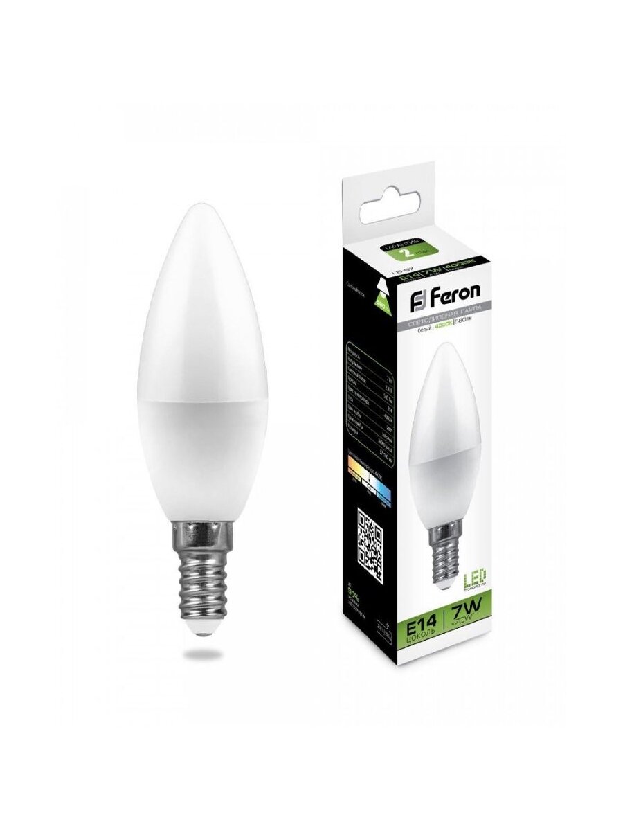 Отзывы на (20 шт.) Светодиодная лампочка Feron свеча C37 E14 7W(580lm) 4000K 4K матовая 100x37, LB-97 25476 Нейтральный белый. Цоколь E14