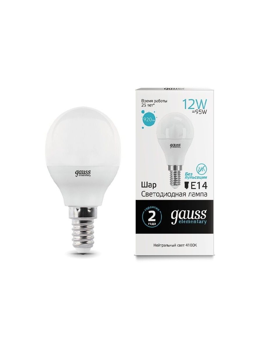 (5 шт.) Светодиодная лампочка Gauss Elementary Шар G45 E14 12W 920lm 4100K 4K 82х45 матовая, пластик/алюм. 53122 Нейтральный белый. Цоколь E14 информация: