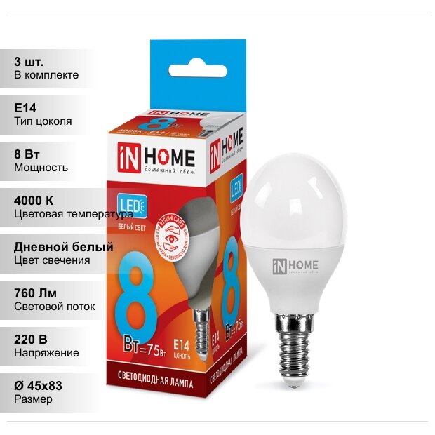 (3 шт.) Светодиодная лампочка IN HOME P45 8Вт 230В 4000К Е14 информация: