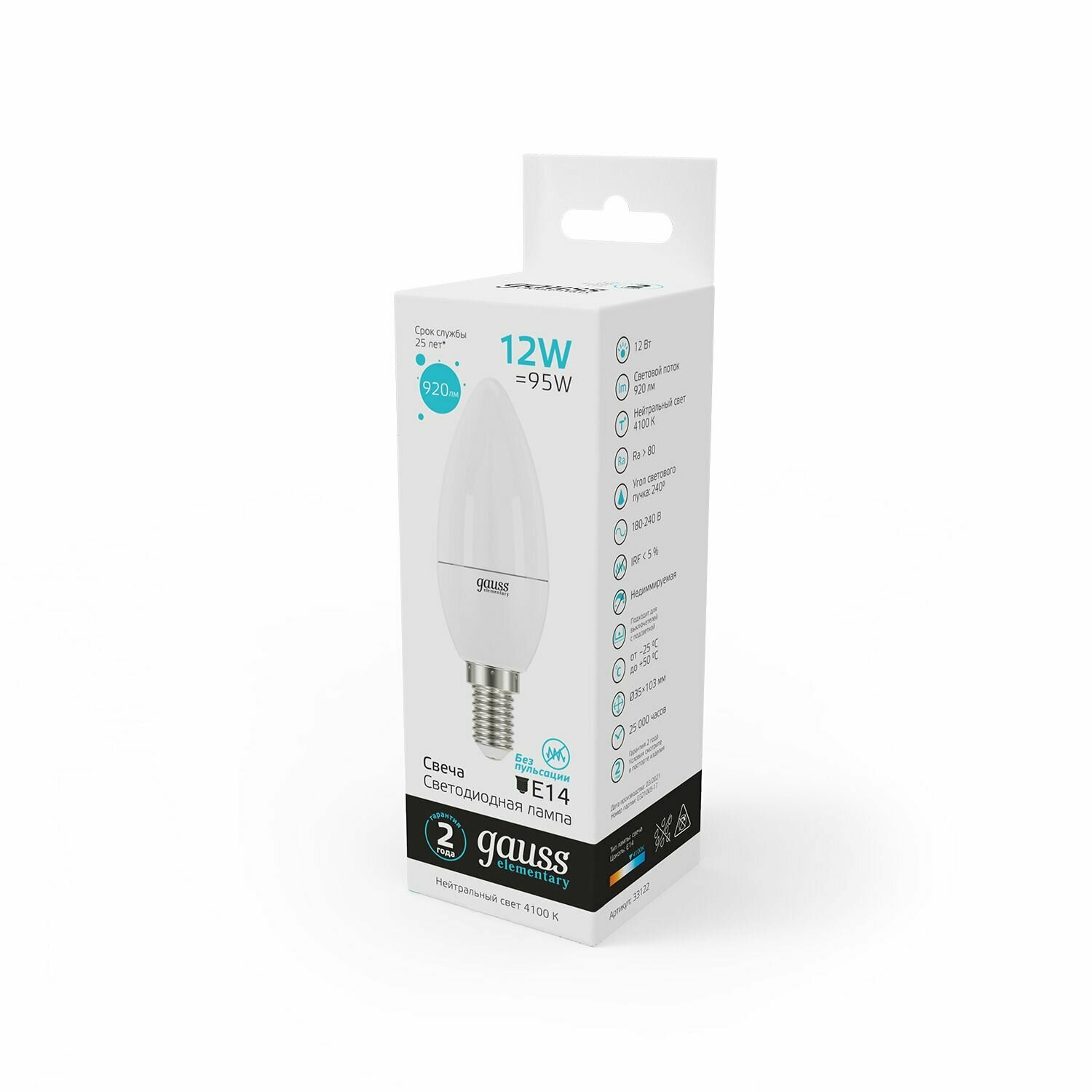 Отзывы на 10шт/уп. Лампа LED Свеча 12Вт 230B B35 E14 920Лм 4100К Свет Нейтральный белый арт. 33122 Gauss, уп. 10шт