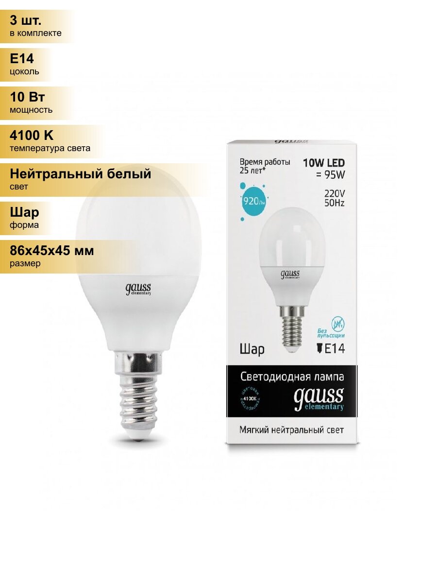 (3 шт.) Светодиодная лампочка Gauss Elementary Шар G45 E14 10W(730lm) 4100K 4K 86x45 матовая, пластик/алюм. 53120 Нейтральный белый. Цоколь E14 информация: