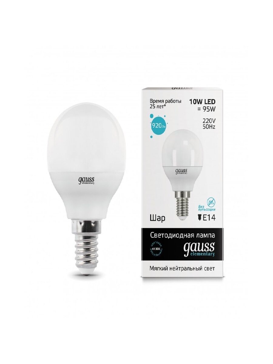 Отзывы на (20 шт.) Светодиодная лампочка Gauss Elementary Шар G45 E14 10W(730lm) 4100K 4K 86x45 матовая, пластик/алюм. 53120 Нейтральный белый. Цоколь E14