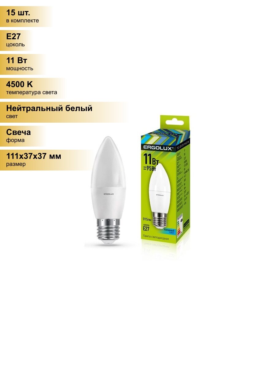 (15 шт.) Светодиодная лампочка Ergolux свеча C35 E27 11W(915lm 220°) 4500K 4K матовая 111x37 LED-C35-11W-E27-4K Нейтральный белый. Цоколь E27 информация: