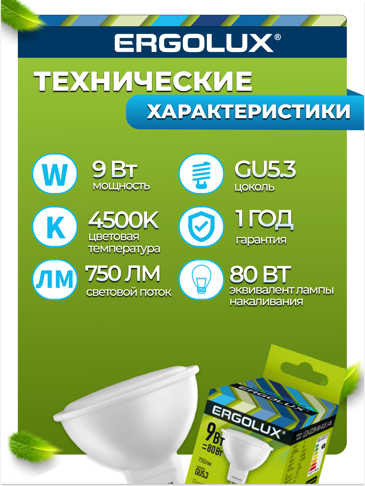 Лампочка светодиодная Ergolux 9W, GU53, 6K